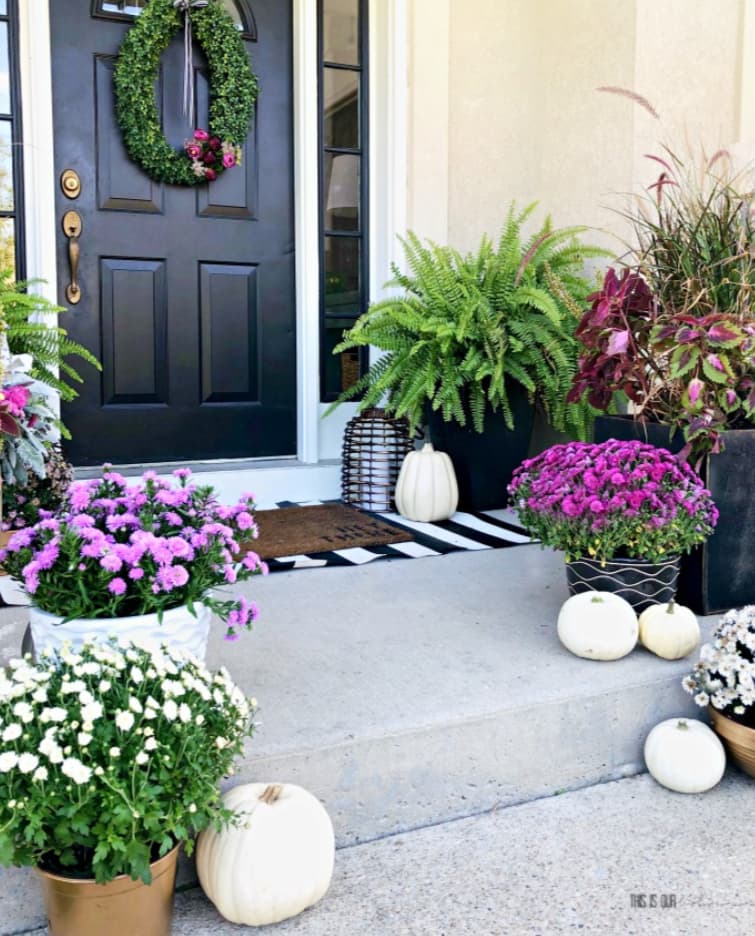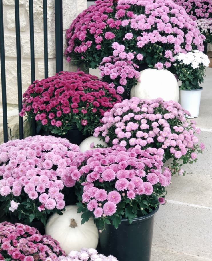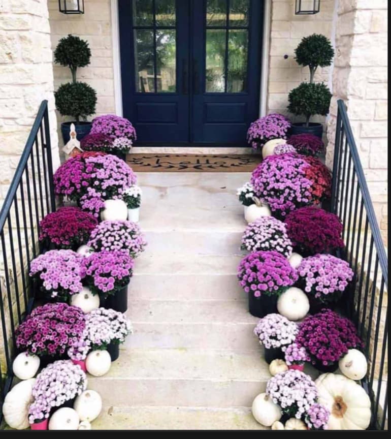 I largely agree with this! Not a fan of the mum yellow or the rust colored flowers. ORANGE is fine but not rust or the dark maroon. I agree that white/cream looks great with fall gourds and I’ll incorporate some branch trimmings (put in a bucket of water that can’t be seen) of green or turned fall colors (red).