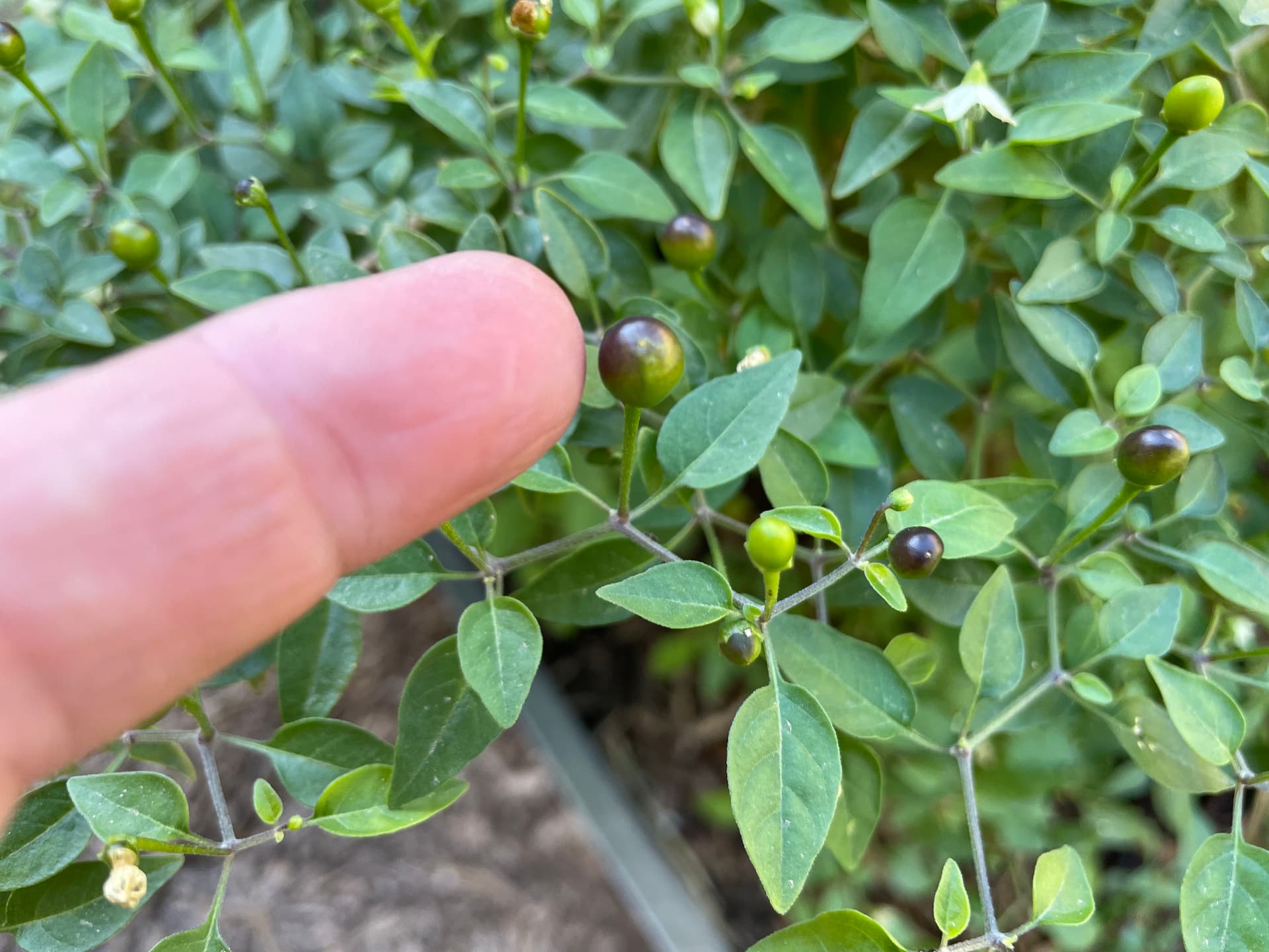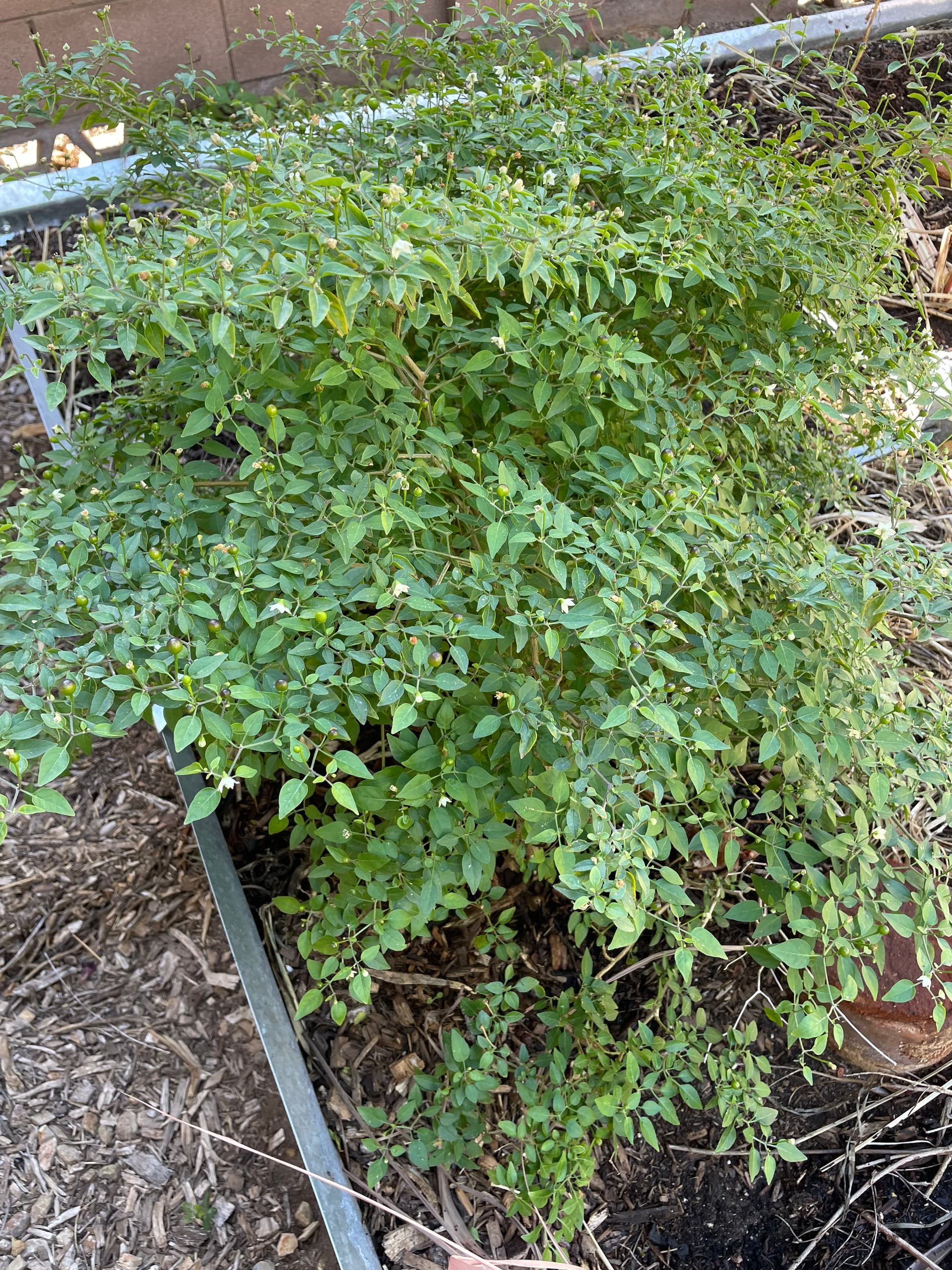 My chiltepin plant is still going strong here in year #2. It’s covered in tiny peppers.