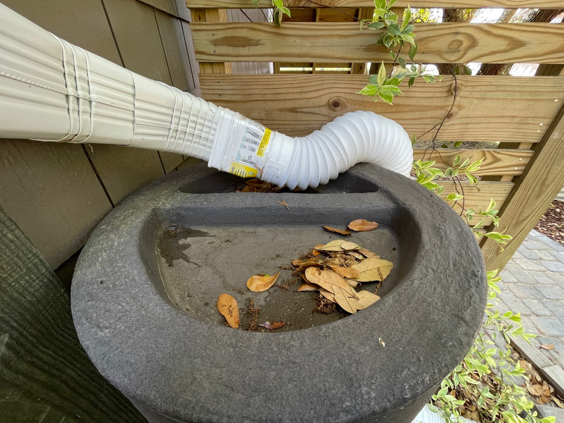 The first downspout has a water exit just above the screened opening in the top. But fearing it would overflow lead us to add an extension drain pipe to divert away to the side yard.