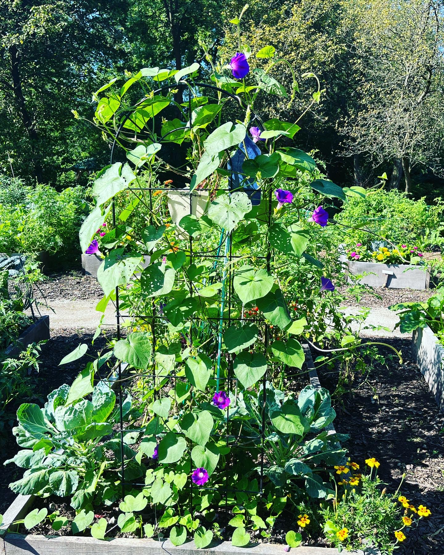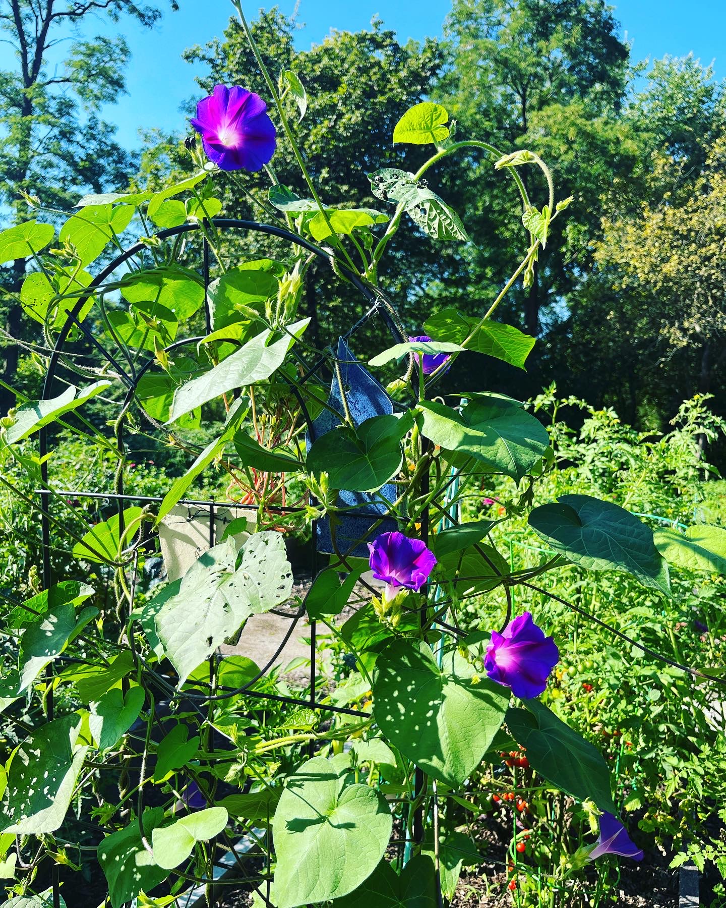 I don’t often get to my community garden in the morning but did yesterday and was greeted by these volunteer Morning Glories (?) that arrived after I took my pea vines out and before the climbing green beans start up the trellis!
