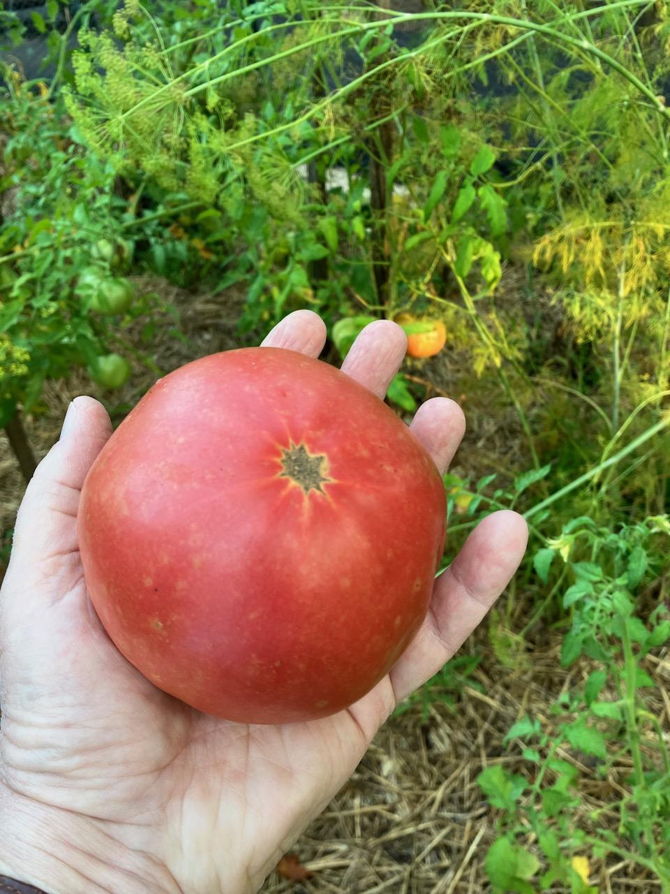 Here is a picture of my first tomato of the season, one of my trusty Tidwell German Pinks: