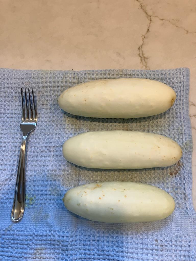 Here are some of the cucumbers that I found (the fork is for scale; I apologize for the dirty dish towel). Three more of these Silver Slicers have been peeled and sliced, and put into a pickling brine in the refrigerator, for dinner tonight.