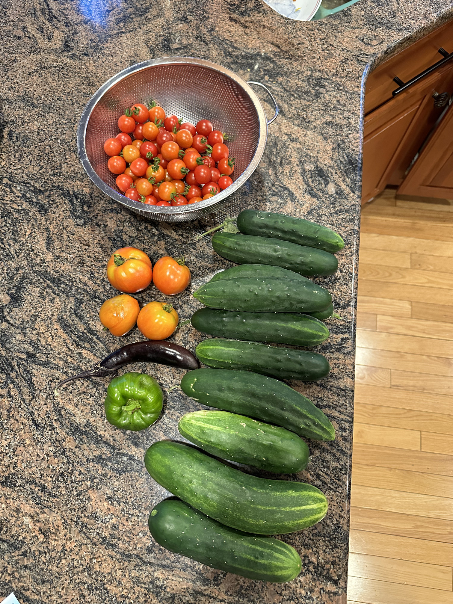 My Japanese cucumbers are still doing very well, but the Armenian cucumbers are barely blooming. I also picked a couple of “American”’ cucumbers (forgot the variety). The Americans like to play hide and seek, and if not picked off the vine right away, they go to seed quickly. The cherry tomatoes are picking up speed, and there is a bunch of big green fruit on the heirlooms.