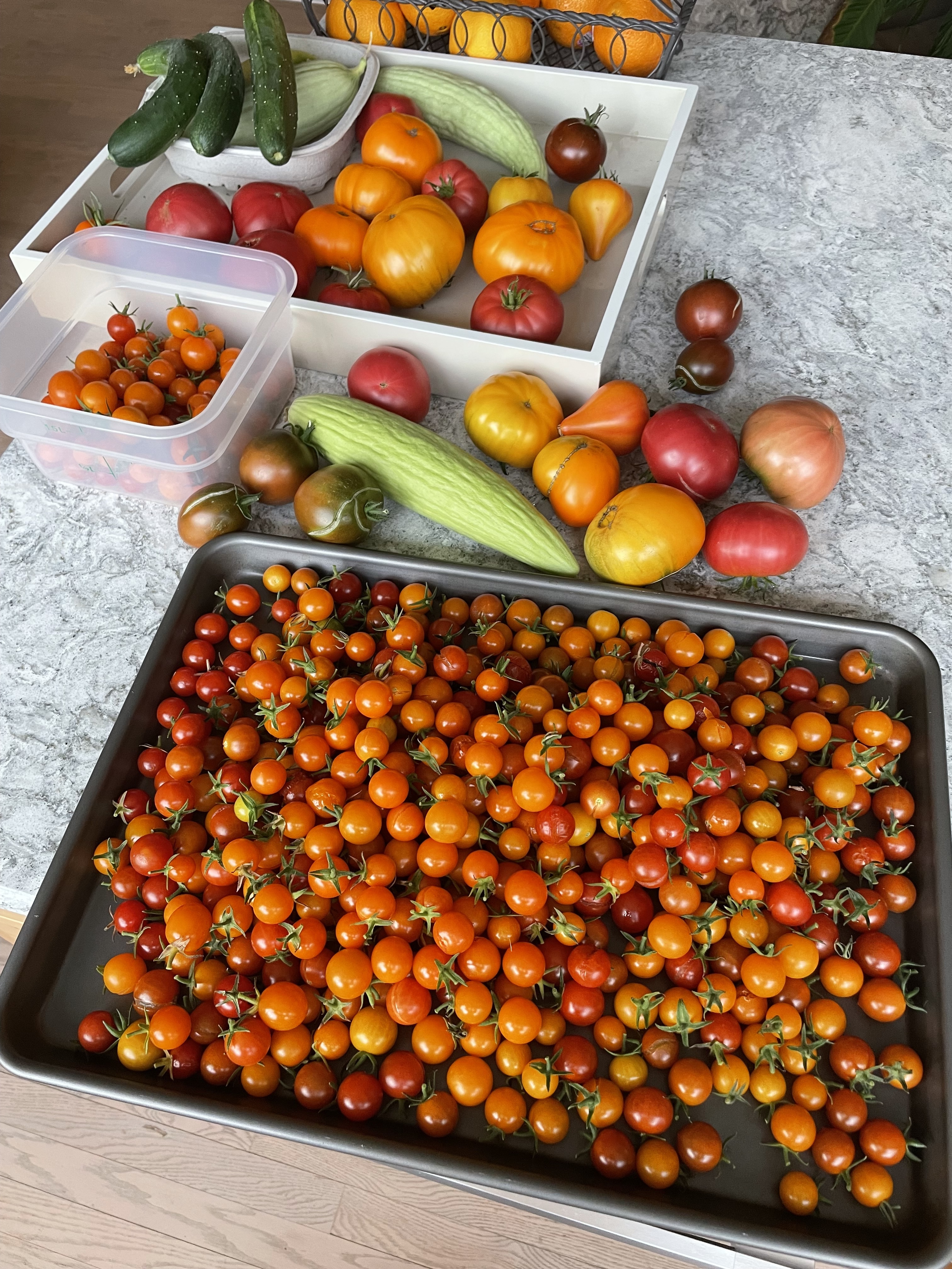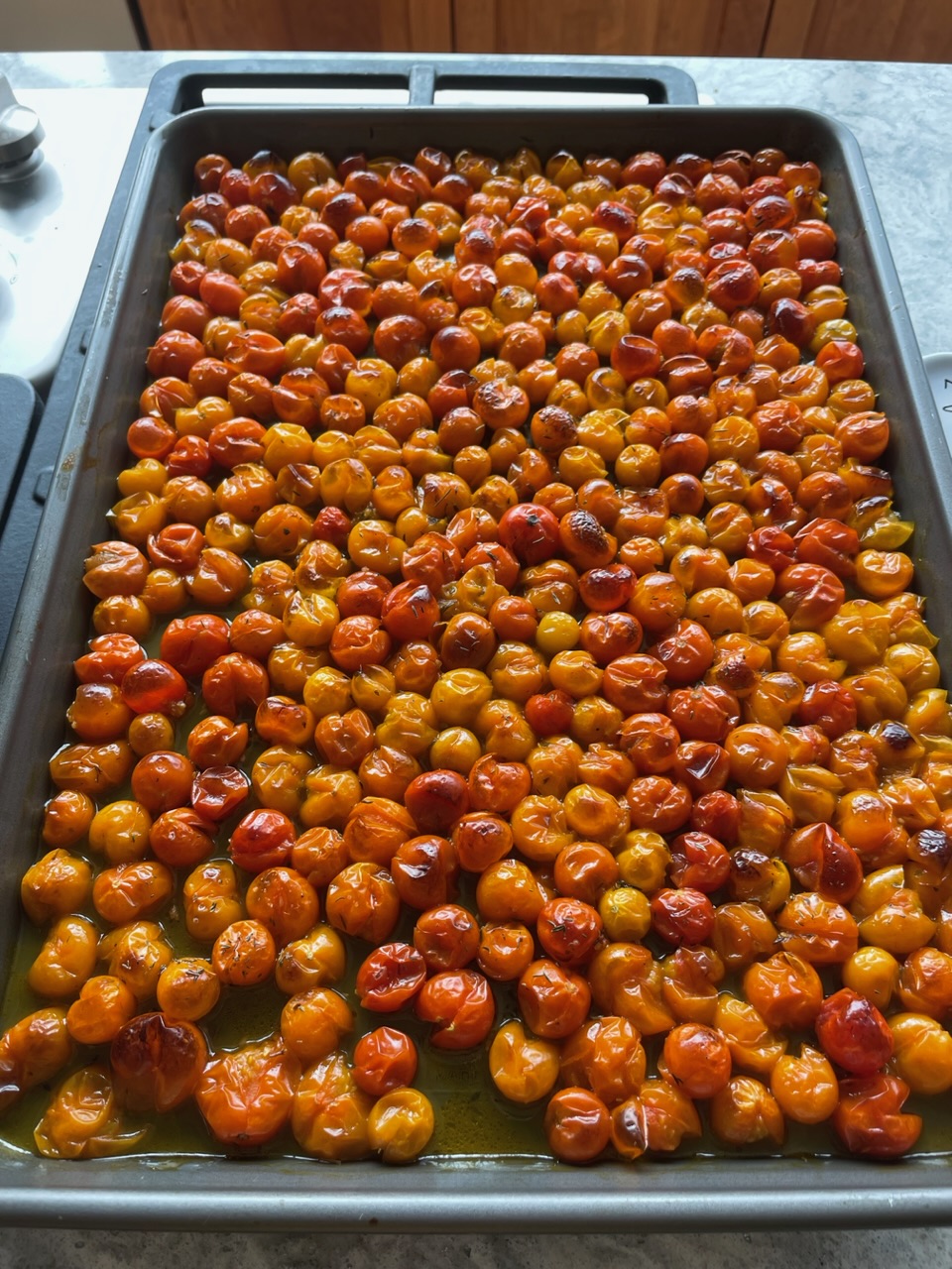 I’m going to bake the cherry tomatoes with EVOO and salt and thyme (450 degrees, 20-30 min depending on oven - to slightly caramelized charred state). Then they can be used as garnish to white fish or pork chops.