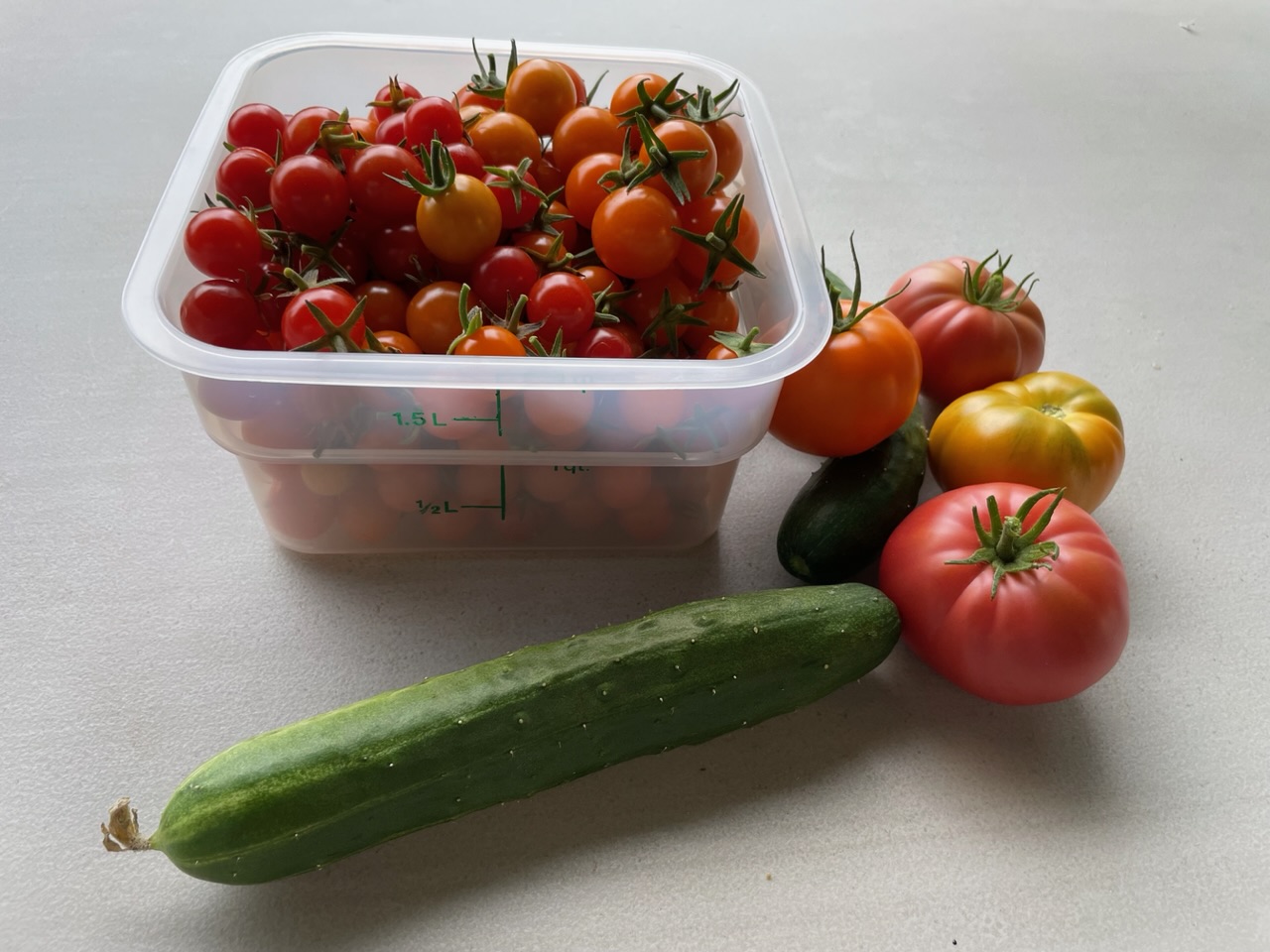 Deck tomatoes are still going strong, and Japanese cukes are real troopers! Despite being forgotten a few times when I watered the rest of the garden, the cukes still keep coming.