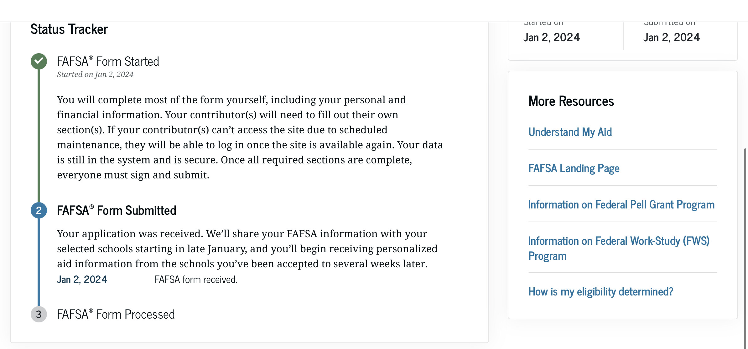 We’ll send you an email when your FAFSA information has been sent to your selected schools and when you can access your FAFSA Submission Summary on StudentAid.gov. The FAFSA Submission Summary will provide your official SAI calculation and Federal Pell Grant eligibility. You can also check the status of your FAFSA form on StudentAid.gov in late January.