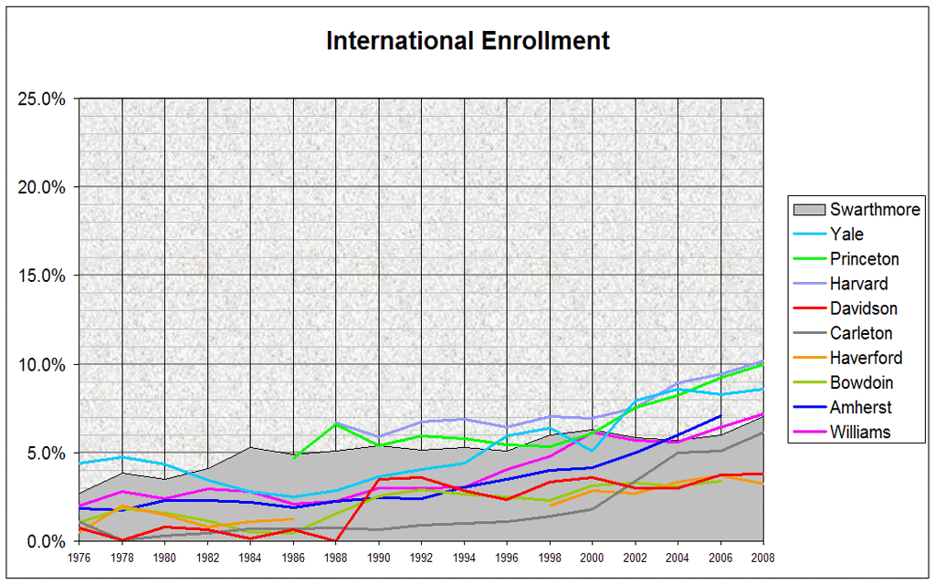 <p>My final comment on this: Of the nine institutions tracked on the Swarthmore-centric (-produced?) graph, Williams enrolled more international students than five others – Amherst, Davidson, Bowdoin, Haverford, Carleton – hardly what I would call “getting clobbered” or not “able to recruit internationals.” </p>