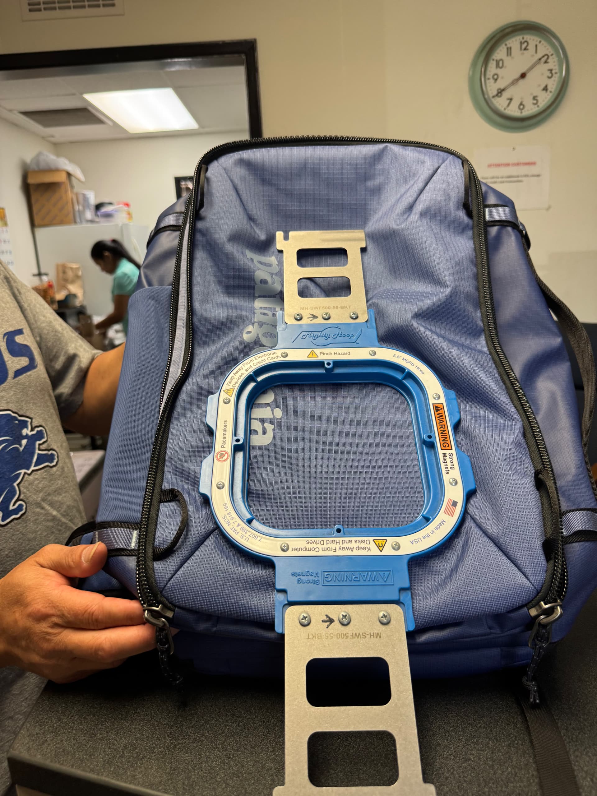 I’m in the process of deciding which backpack we will give out at our end of the year event at work. I need 40 good sized, well made backpacks - we’re leaning towards Patagonia Black Hole 30L. But as a female, I find it much too big. We’ll be embroidering our logo on it, so that’s a consideration as well. That is our embroidery guy’s hoop, checking to see if it can work. A final decision will be made this week. I hope it’s not this one…it would literally be carrying a carryon on your back. It’s huge! If we get it, I’ll never use mine.
