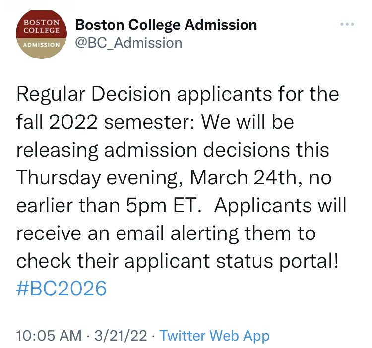 My son and I toured BC over February break. The junior tour guide at the end came up to us and said March 23rd for what it is worth.