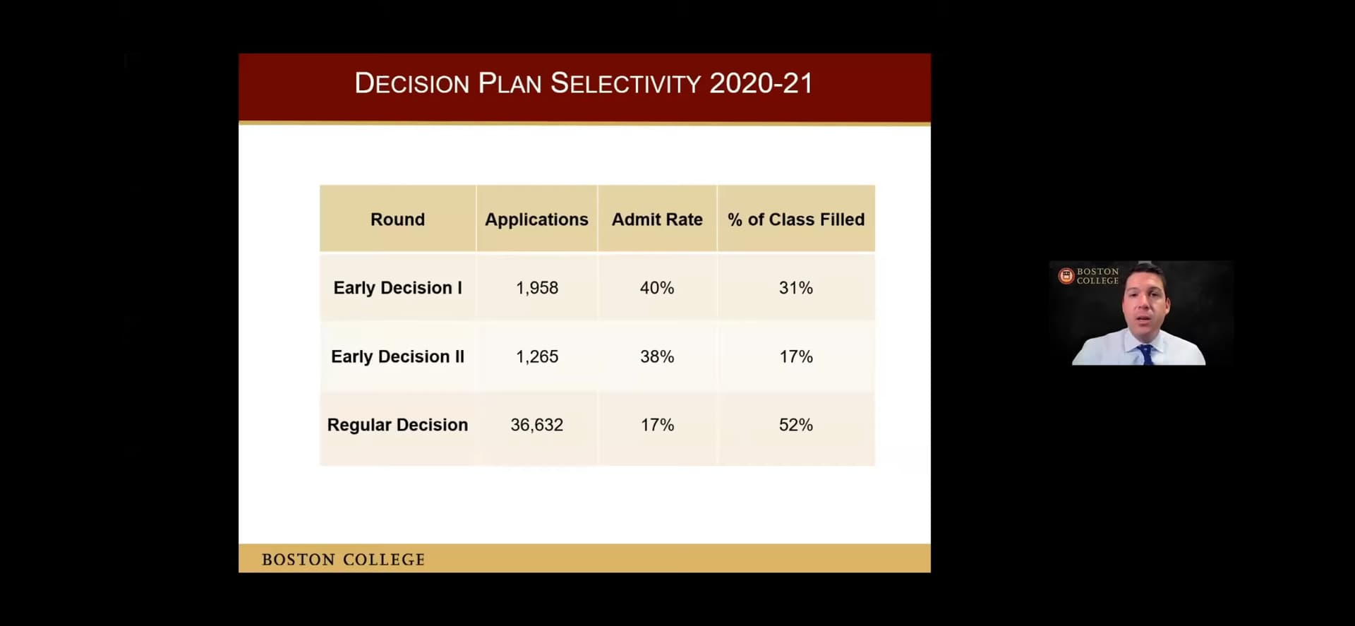 During the 2021-22 admission cycle, Boston College received 4,428 Early Decision applications (ED I and II combined). 28% of ED applicants were admitted, filling 51% of the Class of 2026. During Regular Decision, the remaining 49% of the class was filled from an applicant pool of nearly 40,500 applications.