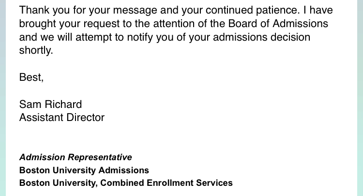 This is their response after my email telling them that it is mid-June and their is still no decision. In a previous response they told me no later than mid-June would the remaining decisions be out