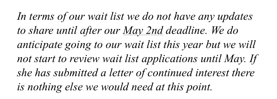 Oof. Welp. Passing this on. Not looking encouraging! Glad we filled out housing and made move in plans for her accepted school!