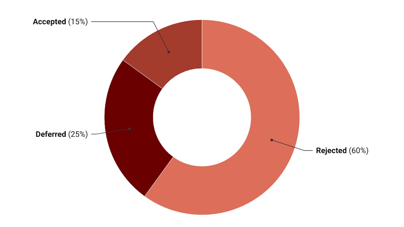 “Another change this year, Powell said, was an increase in the number of students who were rejected as opposed to deferred. The University rejected 60% of early applicants, while 25% were deferred for review in the regular decision process. Last year, the University deferred 30% of early applicants.