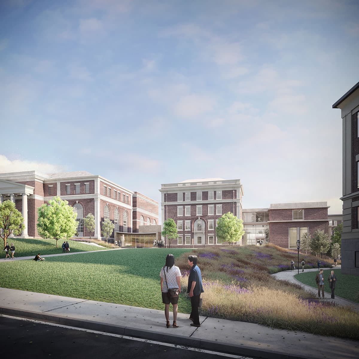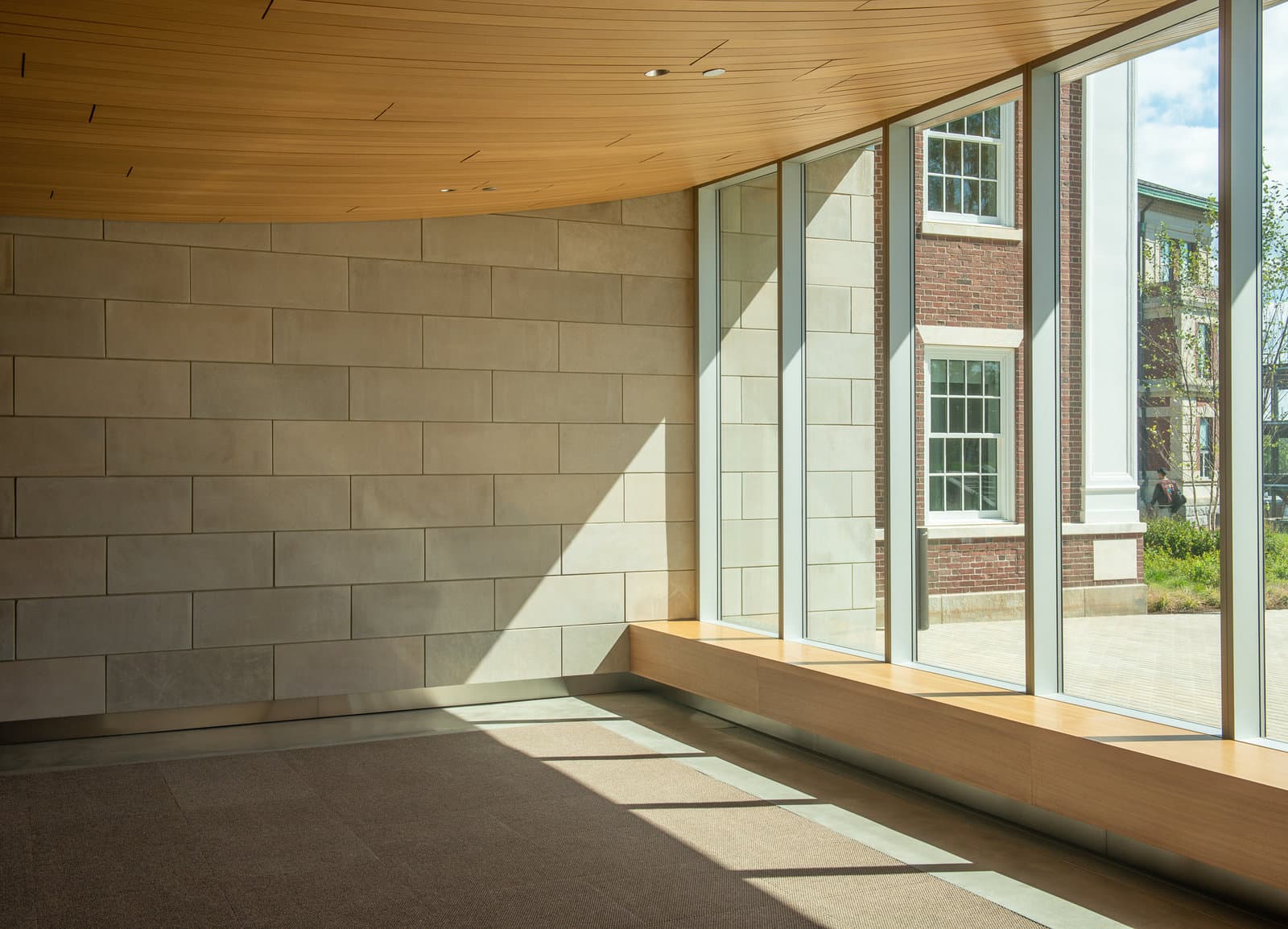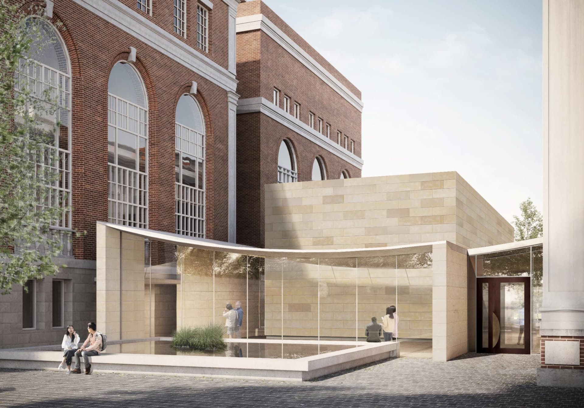 Wes CFA Part II - the new art gallery sandwiched between Merriman Hall and Olin Library. Still unadorned classicism with Beaux-Arts inspirations? Same materials (limestone blocks), some of the same geometry but with a modern looking “swooping” roof and a lot of glass at the entrance.
