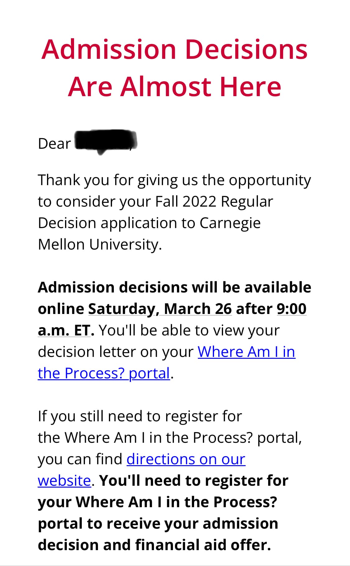 Itâd be pretty funny if CMU sent an email specifically to rejected students telling them when they could log in to read their rejection letters.