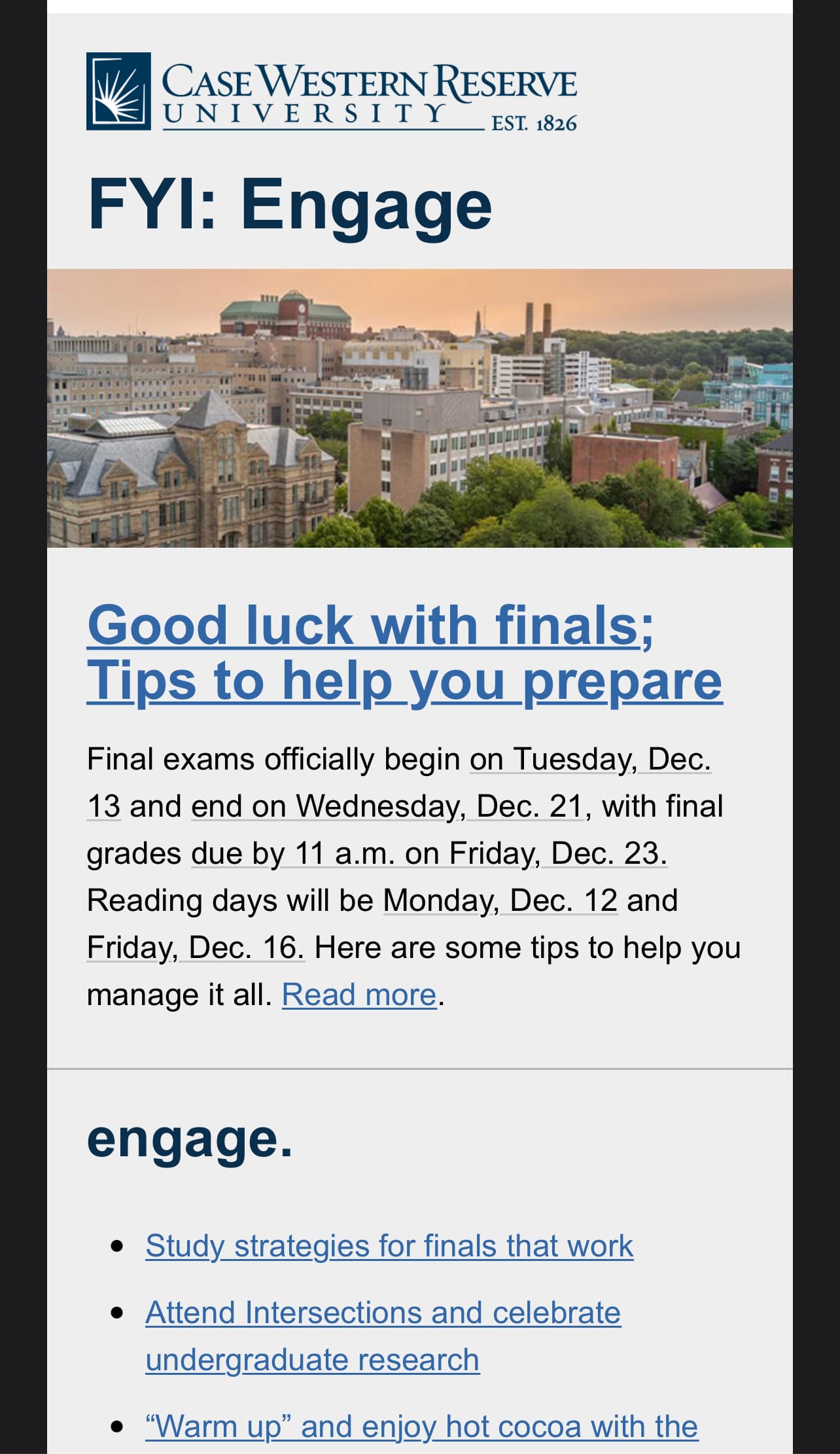 Truth is the applicant would have hated CWRU. The school is very electrically chatty even to students and parents once there. Each student has not just advisors but a navigator to help them almost hand hold them through the process. I get daily or weekly at the least email updates telling me what is happening on campus and my daughter jokes about having to figure out when she has a package due to all the CWRU mail. If a student doesn’t want an email chatty school. CWRU is not the place.