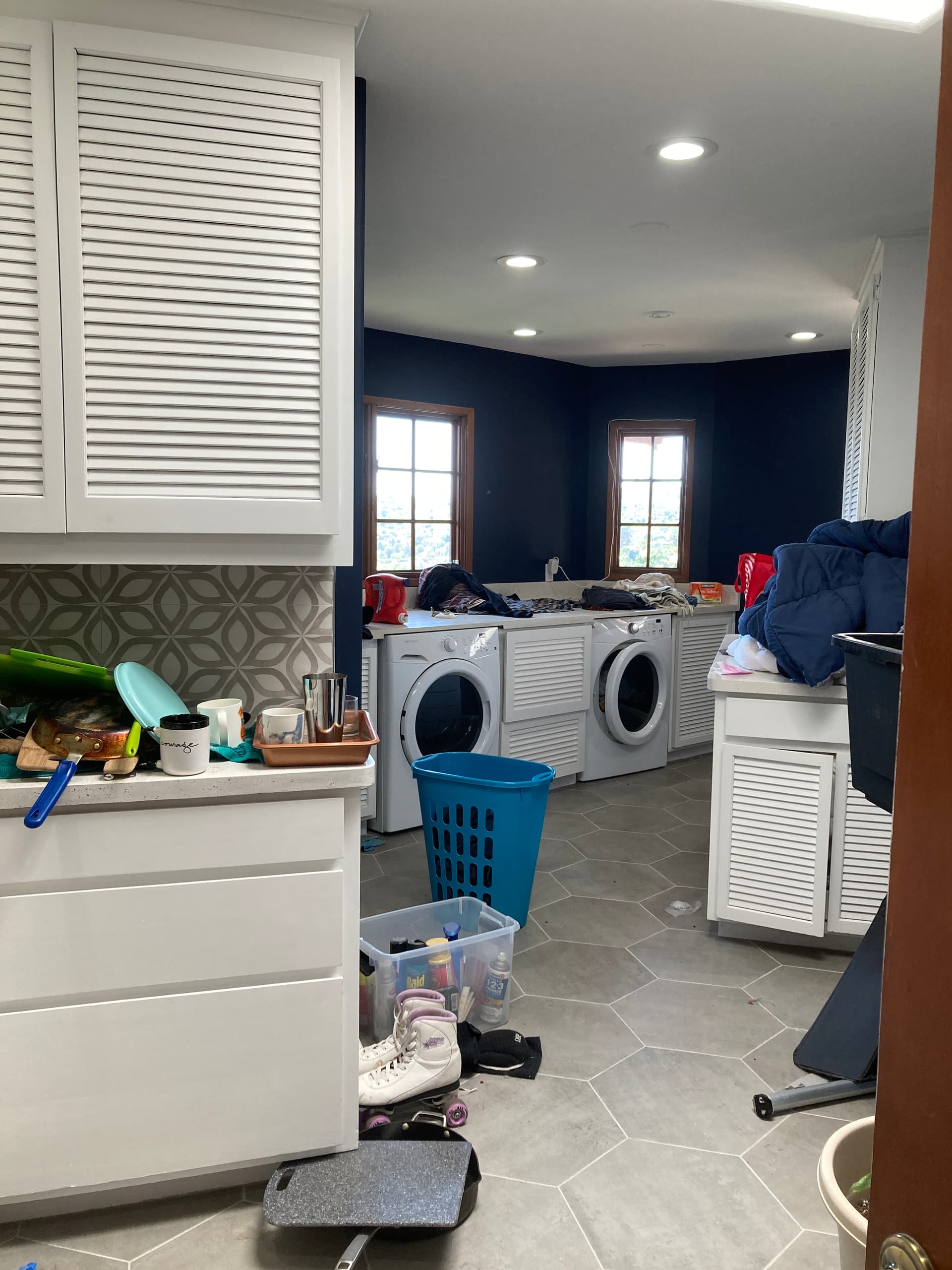 I’m convinced he throws laundry in the dryer, pulls it out later, and just dumps it on the countertop. Both countertops have huge piles of clothes