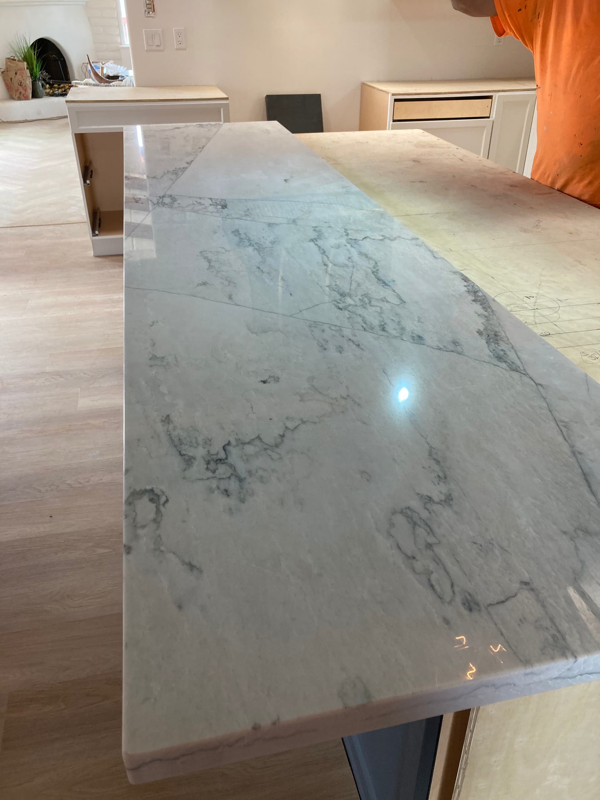 Here is the beautiful White Macaubus quartzite countertop. It’s not normal Macaubus with the subtle stripes. This one has a lot of movement and pattern