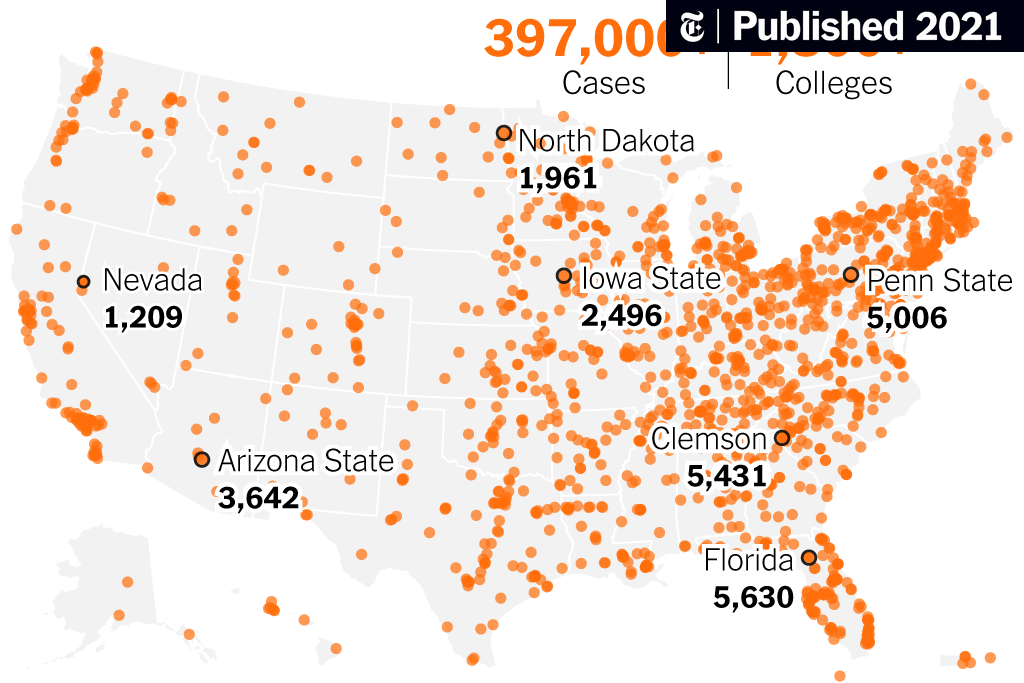 “Tens of thousands of new coronavirus cases continue to emerge on college campuses. A New York Times survey of more than 1,900 American colleges and universities — including every four-year public institution and every private college that competes in N.C.A.A. sports — has revealed more than 397,000 cases and at least 90 deaths since the pandemic began.”