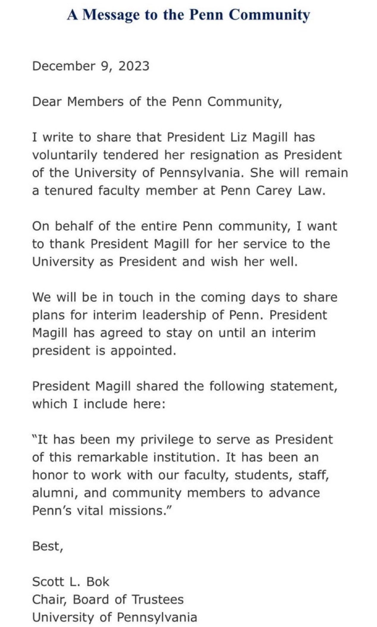 Former President Liz Magill last week made a very unfortunate misstep—consistent with that of two peer university leaders sitting alongside her—after five hours of aggressive questioning before a Congressional committee. Following that, it became clear that her position was no longer tenable, and she and I concurrently decided that it was time for her to exit.