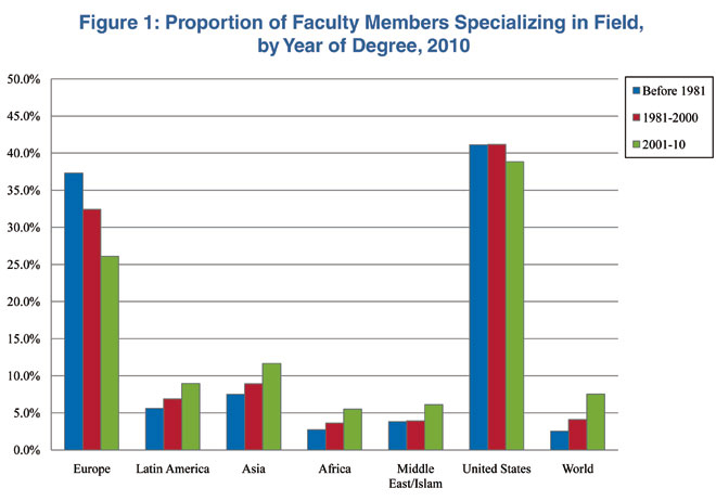 Though this is true, American history and 20th century history (especially WWII) are well represented in virtually all history departments. The charts below, courtesy of the American Historical Association, give you some idea of the relative popularity of US and European history (~2/3 of history faculty).