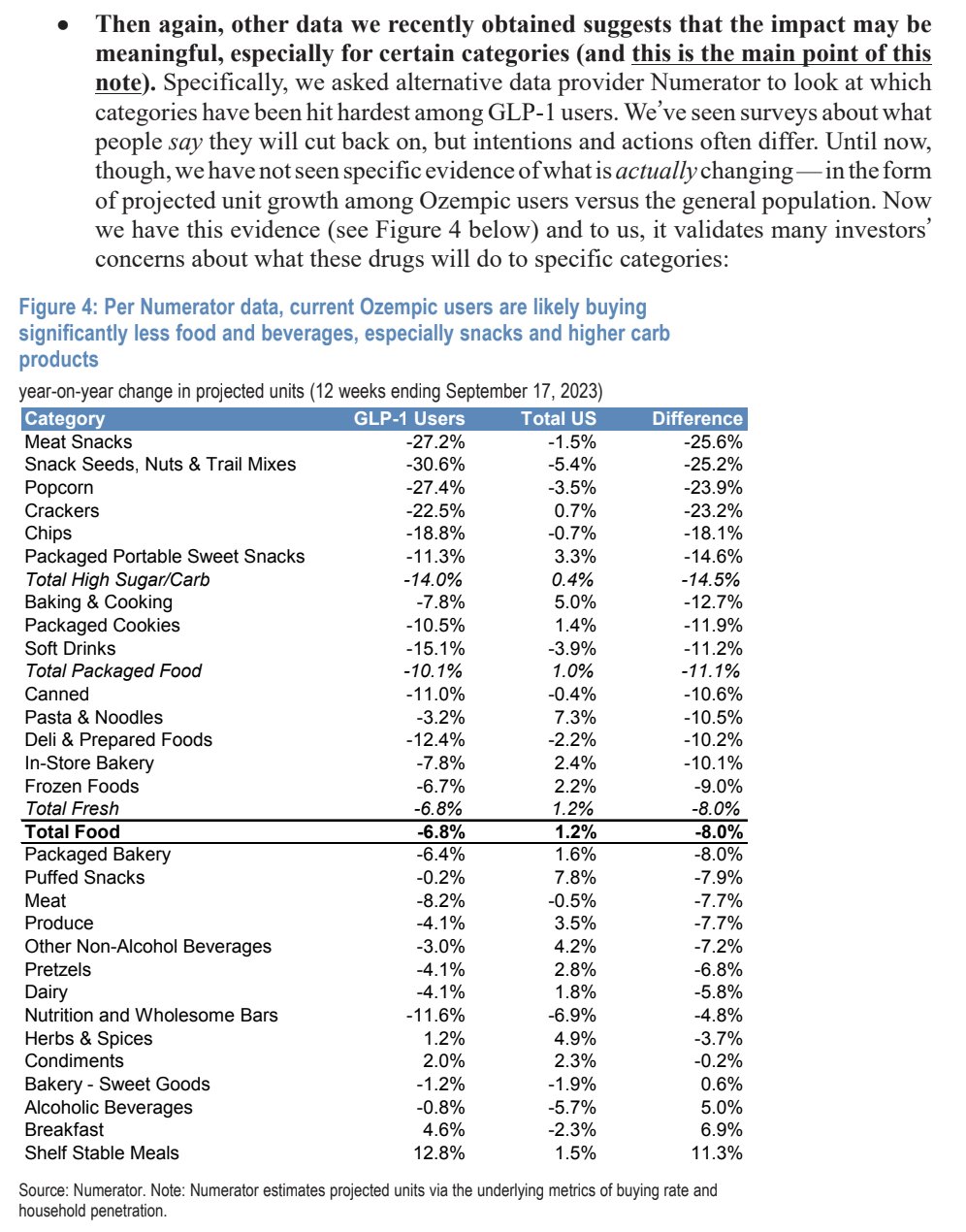 The reduction in calorie intake, particularly snacks, is very substantial. Here’s an excerpt from a Wall St analyst report estimating the reduction in food purchases amongst Ozempic users: