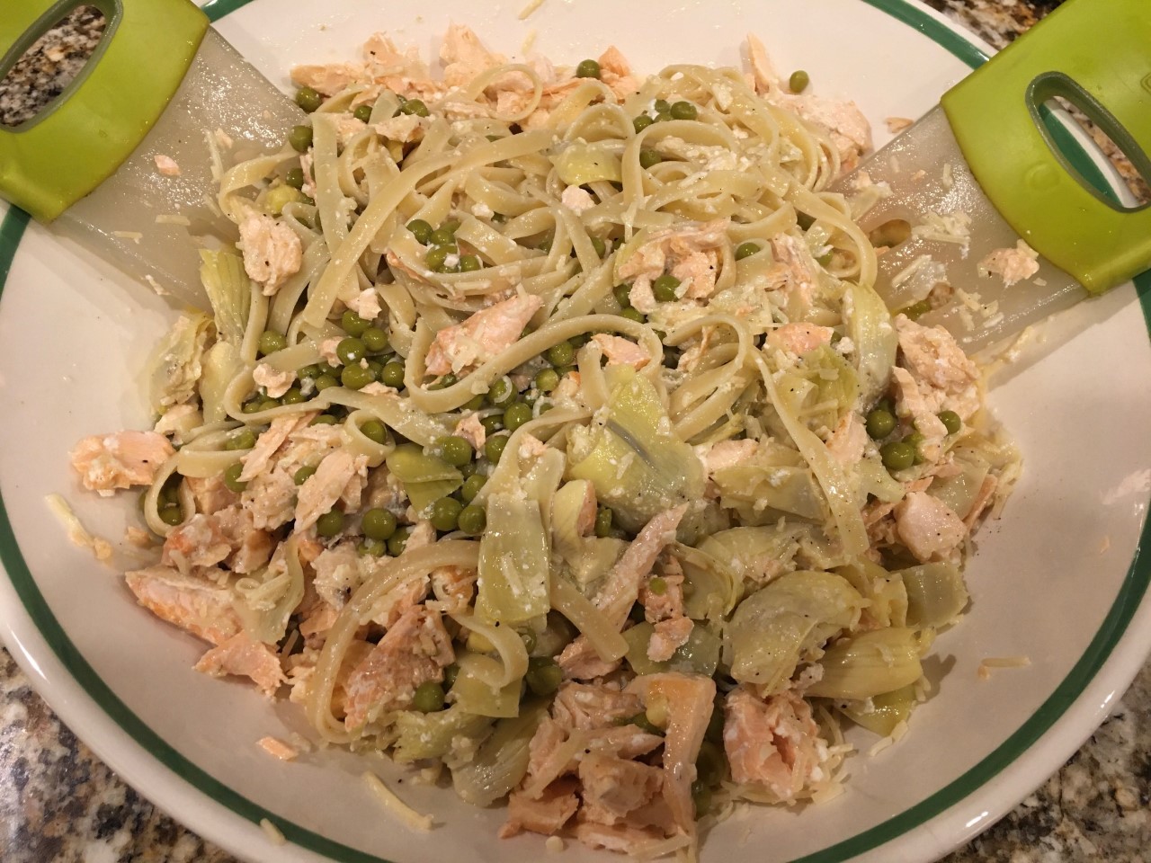 We don’t do a lot of pasta, but I went large and made DH’s favorite tonight–salmon fettucine. I don’t use a recipe for this one, just fettucine, pan-seared salmon, artichoke hearts, and peas tossed in a butter-cream sauce with a cup of shredded parm: