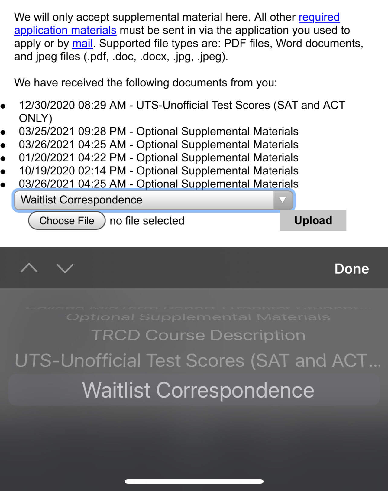 the ‘waitlist correspondence’ is one of the options in the drop down on top of the “choose file” button on the portal.