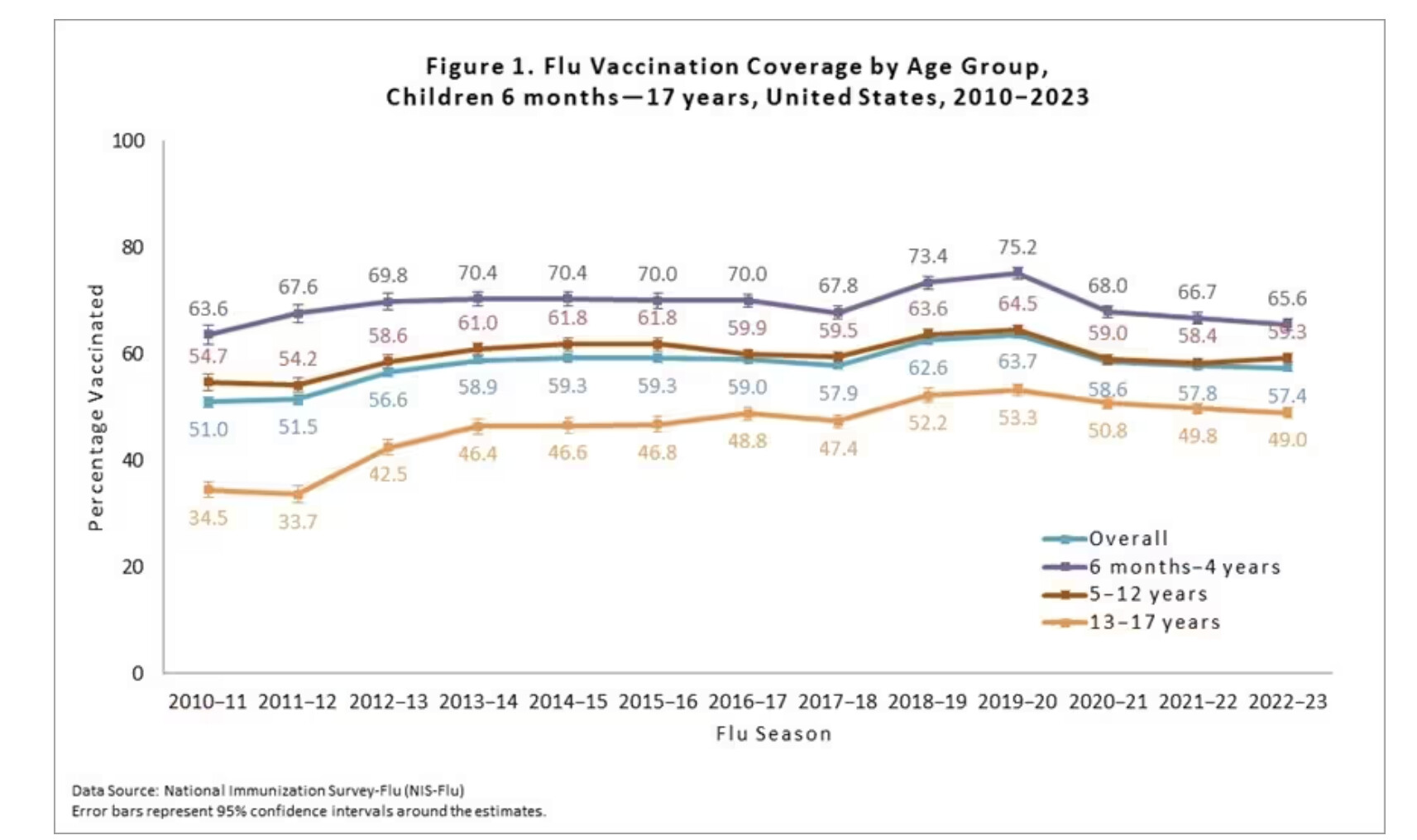 Also in the article is information on the low uptake of flu and covid vaccines. <33% of children and <35% of adults have gotten a flu shot. <5% of children and <14% of adults have gotten the updated covid shot.