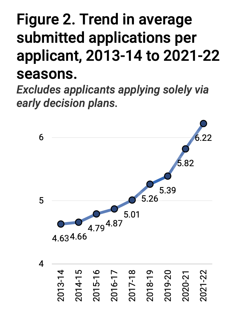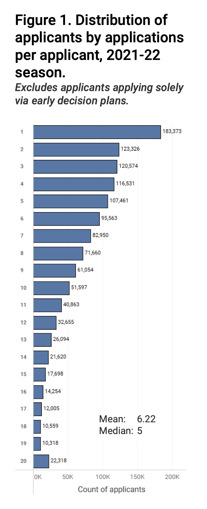 Here’s actual data from the common app platform. Obviously this won’t capture UC applications, nor Coalition, or any individual outlier schools. As you can see most kids apply to 5 or fewer schools, with 1 (1!) being the most common by far. Really highlights how the CC community is not especially reflective of the larger “applying to college” universe.