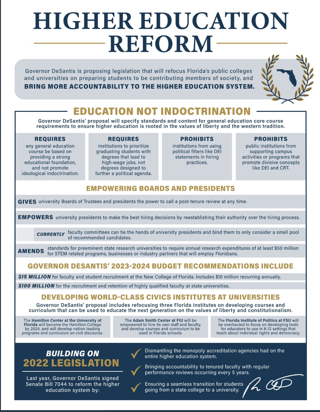 Is there a link somewhere to more of the details on DeSantis’ Higher Ed Reform Plan? I don’t really want to read a massive legal document, but just if you happen to have found something with a little more detail than the one page flyer…?