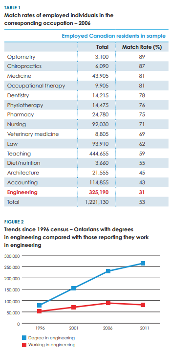 Only 29.7% of employed individuals in Ontario with bachelor’s degrees or higher in engineering were working as engineers or engineering managers.