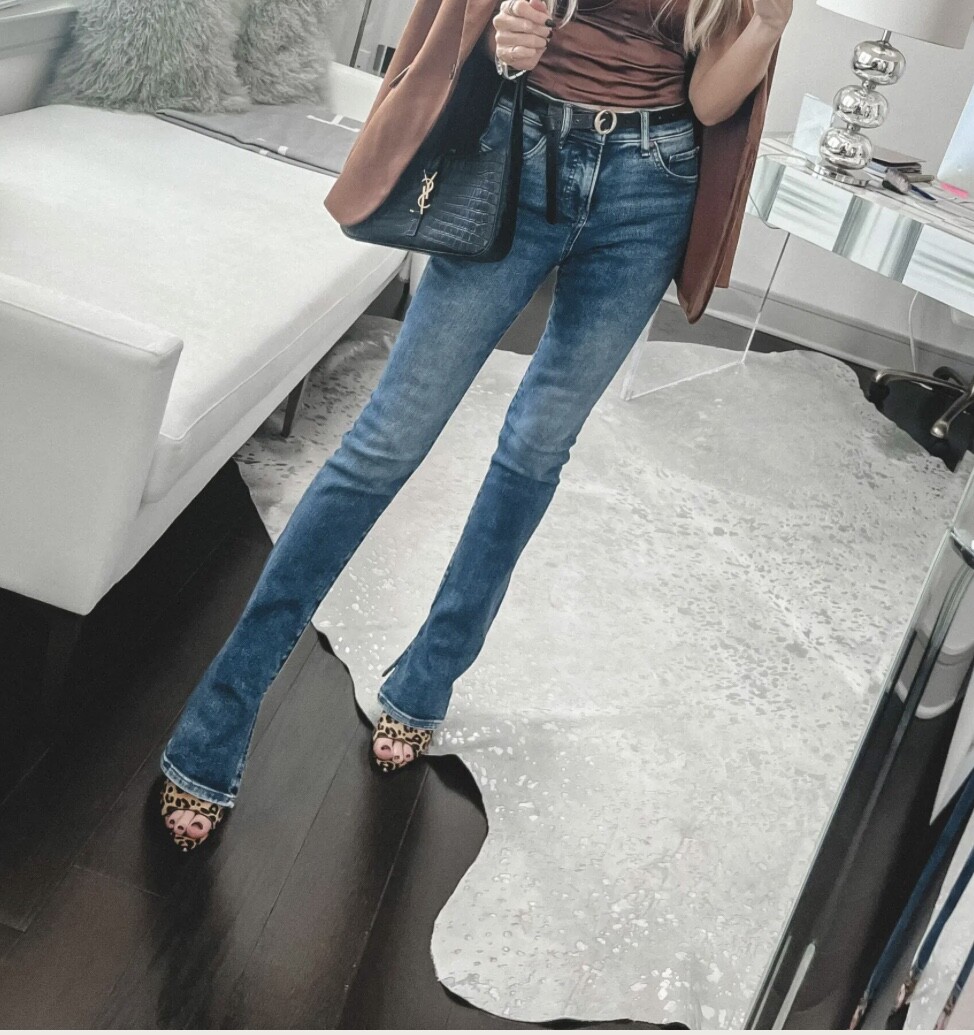 I think the trendiest is the bootcut/flared that is slim (snug) through the thigh. But skinny’s are still worn. The ones I’m sort of hesitant to wear now are my distressed ones. Longer cropped wide legs are in, too.
