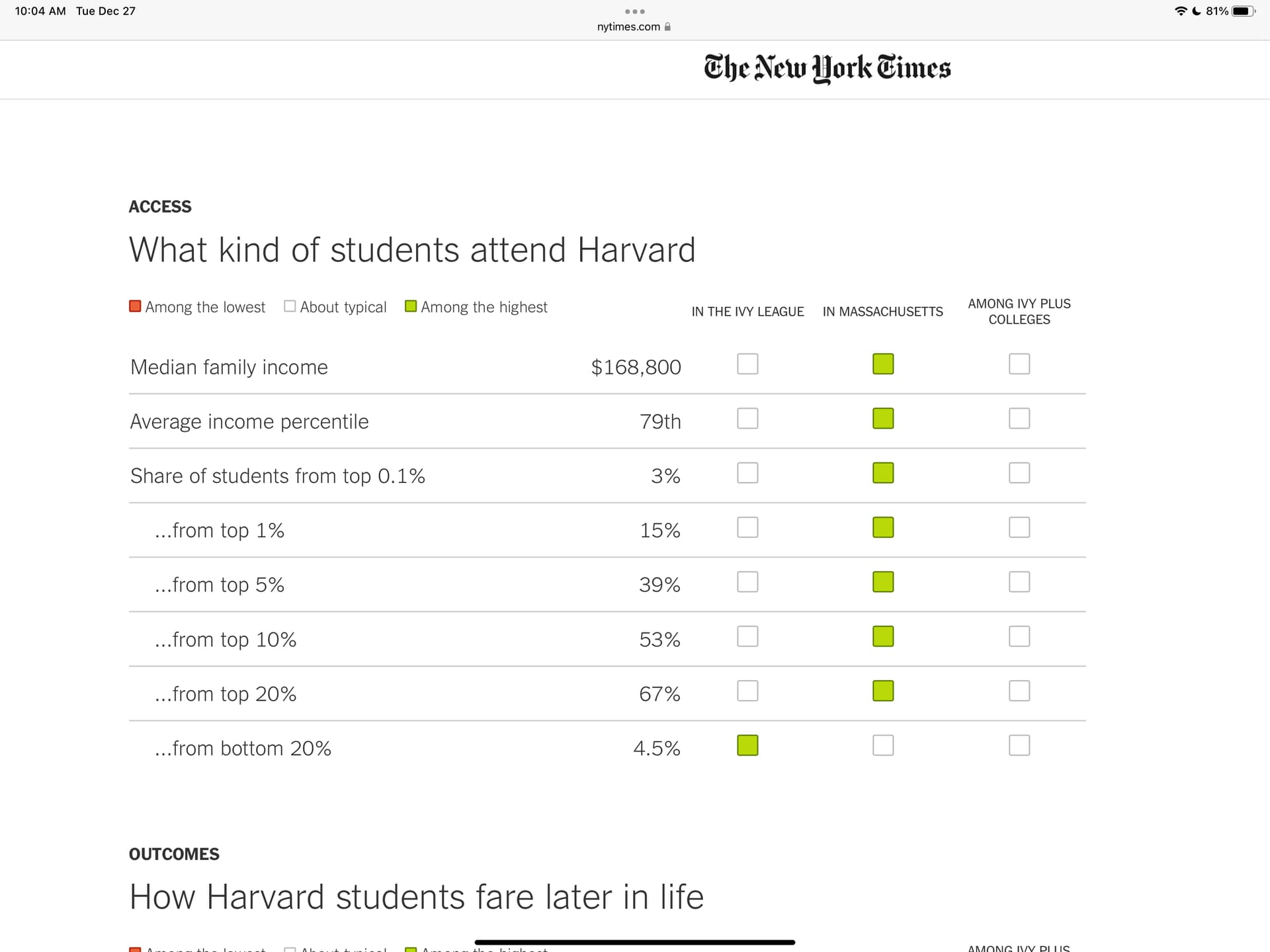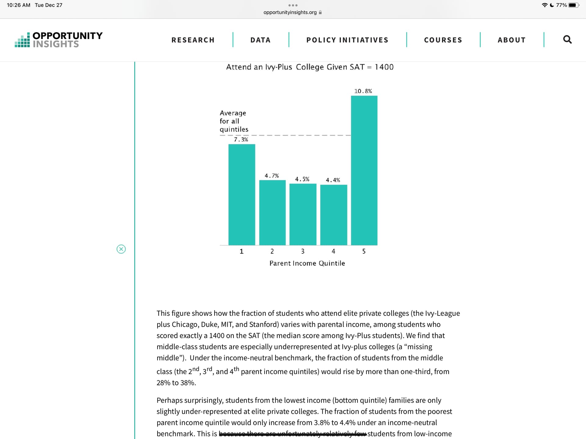 I looked up the Chetty data on Harvard myself, and found that 67% of their students come from the top 20% of the income distribution, whereas 4.5% come from the bottom 20% of the income distribution, and the rest in between. This is much more beach-cliff shaped than barbell shaped. And as the previous poster said, Harvard has more kids from low-income families than most selective 4-year colleges. I did some extra poking around on Chetty’s research organization websight — opportunityinsights.org — and found that you do get a barbell shape IF you hold SAT scores fixed. So for the subset of kids with a 1400 SAT, there are more low-income and high income kids at the most selective colleges than you might expect, and fewer middle income kids. However, numerically speaking, there aren’t very many low-income kids with 1400 SATs…
