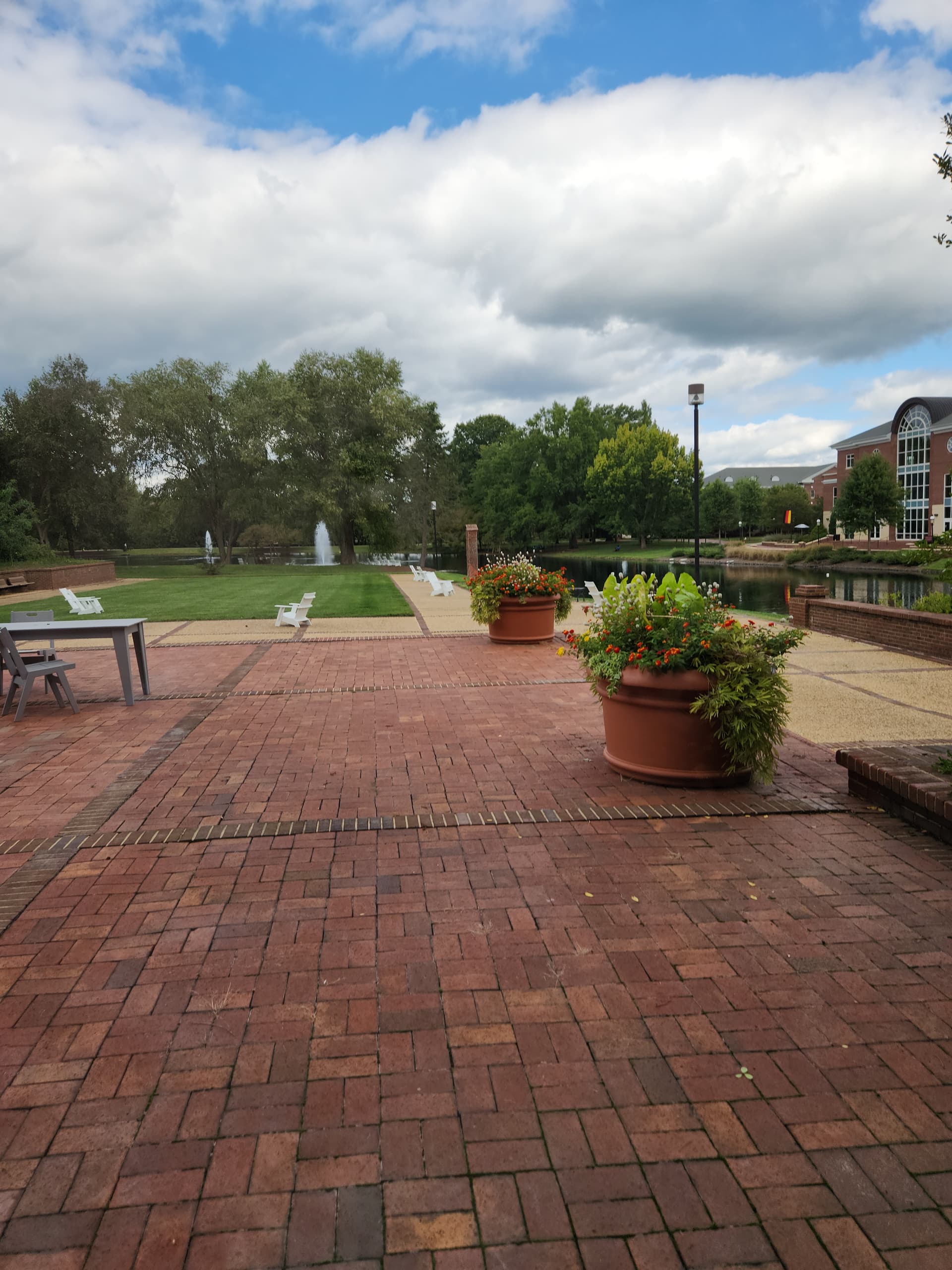 This area surprised me - outside patio behind the performing arts building. I don’t know what it’s used for and it had just stopped raining so no people around on a Sunday afternoon. Looks are not why D chose the school, but it’s a nice bonus having lots of pleasant places to relax. Across the lake are places where students from the Global dorms hang out.