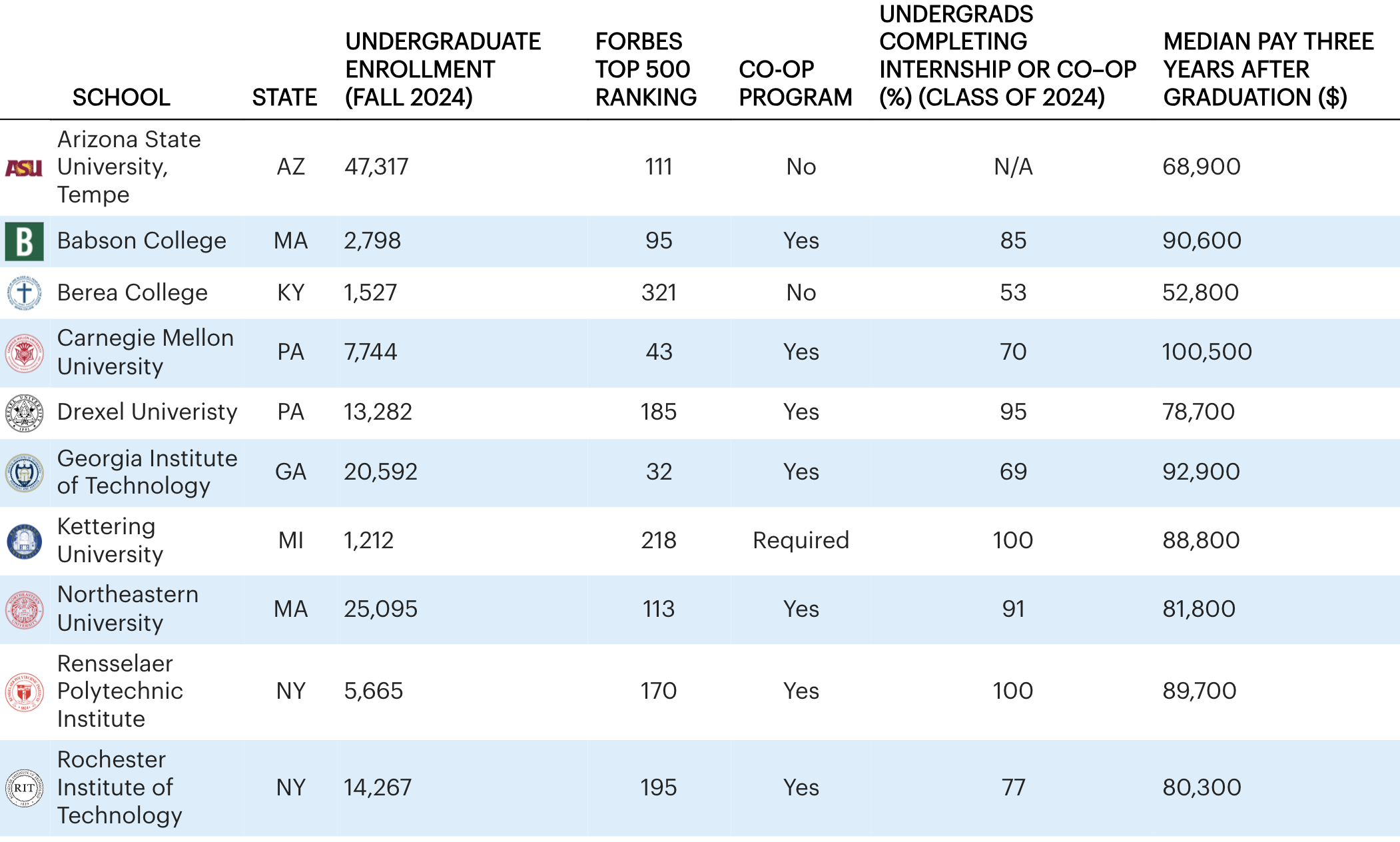 With job prospects for new grads dim and AI spreading, Forbes searched out the schools that make it a priority to help students with co-op programs, internships, coaching and more.