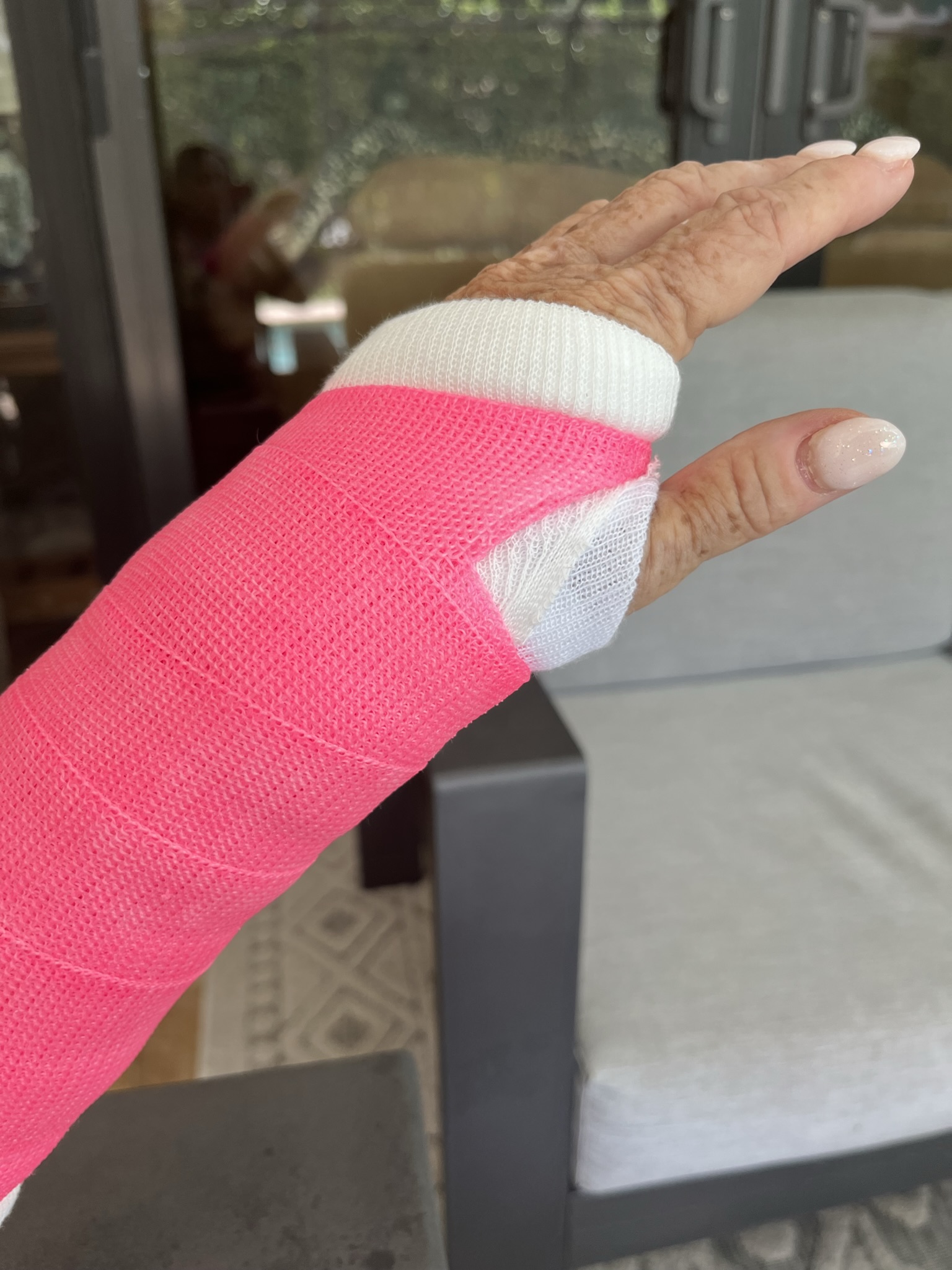 It’s been years since I could put my bag up. One, I’m short, so I have to stand on the seat edge. Then, I had elbow surgery and had a back brace. Now, my wrist is in a cast