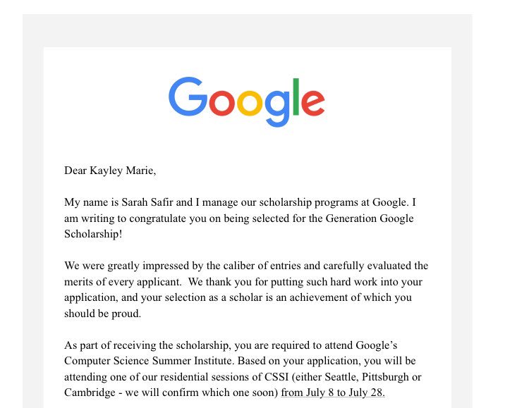 hey guys im the girl who posted it on twitter aka @kayleytbh. i found out i got in on the april 19th at around 3pm. i won the scholarship and the residential program. if anyone is curious im a girl, im filipino (underrepresented), did girls who code and am taking cs classes at my community college, and very low-income.