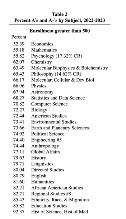The images above (post #4) suggest that about 3/4 of engineering grades at Yale are A or A-. Economics and math had the lowest percentage of A or A- grades (a little more than half). The common pre-med subjects (chemistry and biology) were in-between.