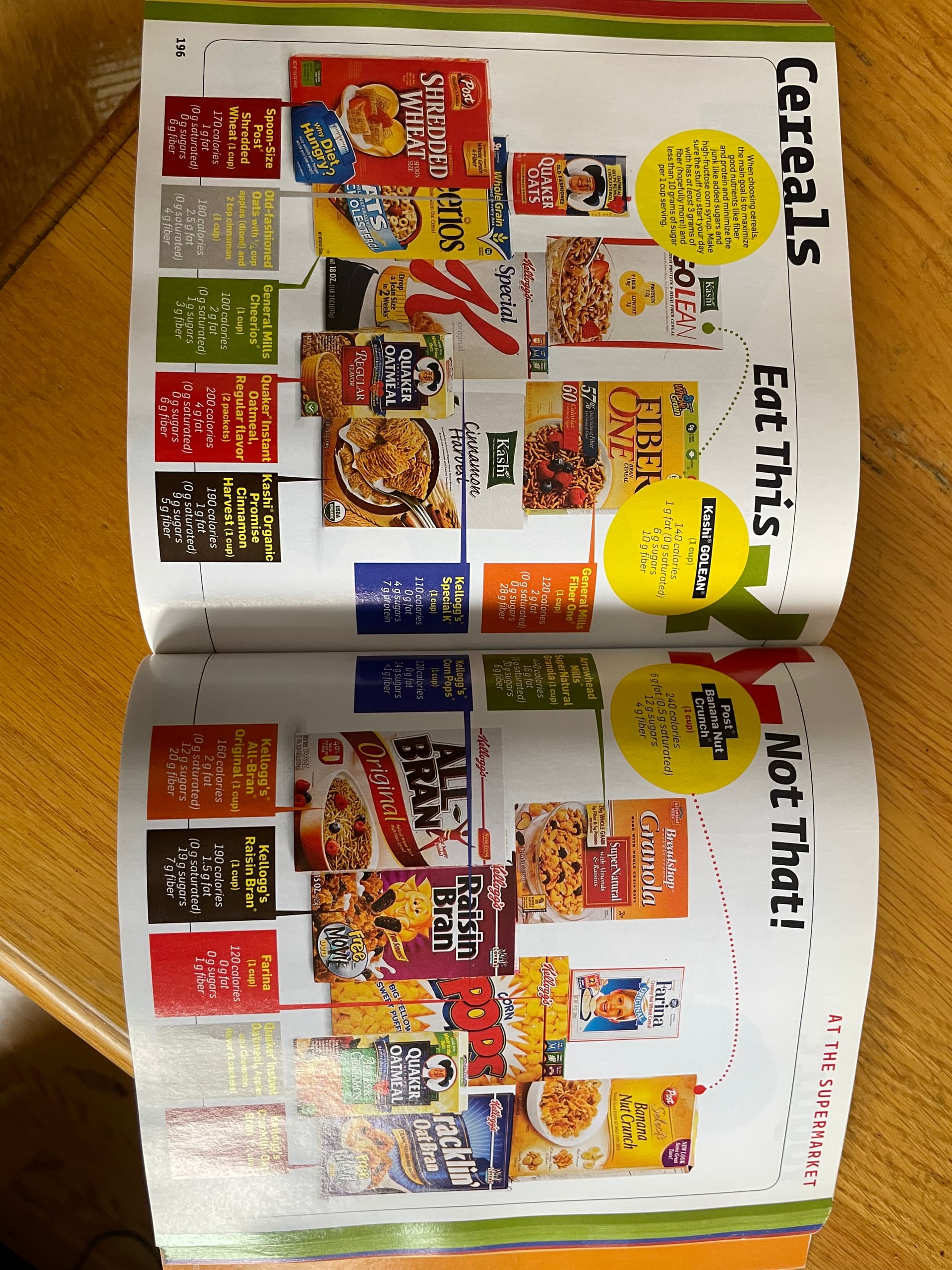 IF you are going to be eating processed foods (I certainly do), then it’s fun, visual way to find things on the Left/better page that you like as well as the Right page. Example photo is of Cereals page. Unsurprisingly I see my favorite breakfast food, Fiber One (original) cereal is on the left page.