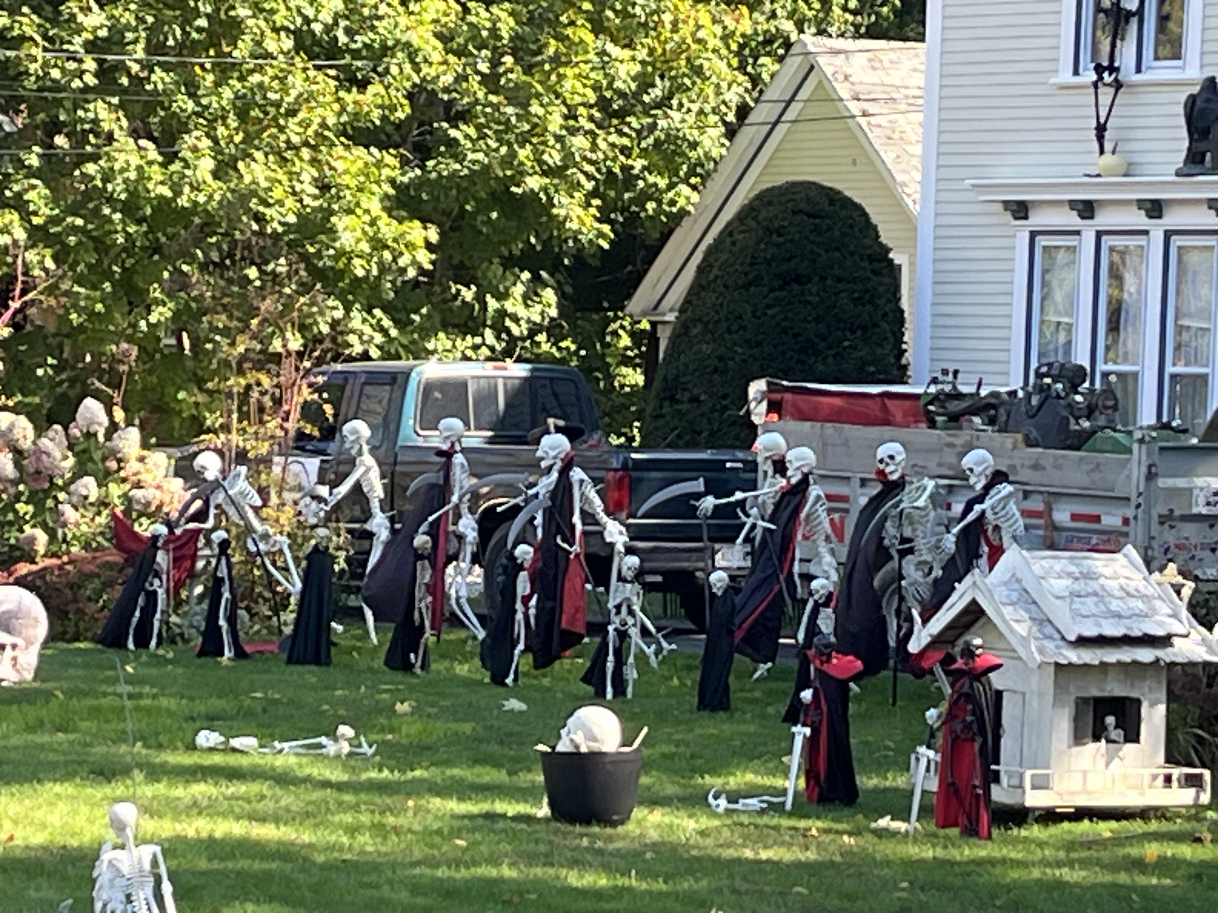 Unfortunately I can’t post a photo yet. One of my favorite Halloween yard decorations were chicken-wire figures. You can barely see them during the day. At night, they really appear ghost-like. Lots of examples on the web if you google “chicken wire ghosts”