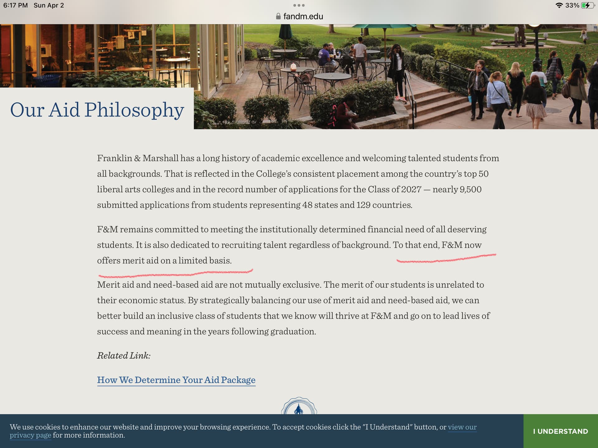 - Franklin and Marshall College (RD) 15k/yr merit scholarship COA 70k