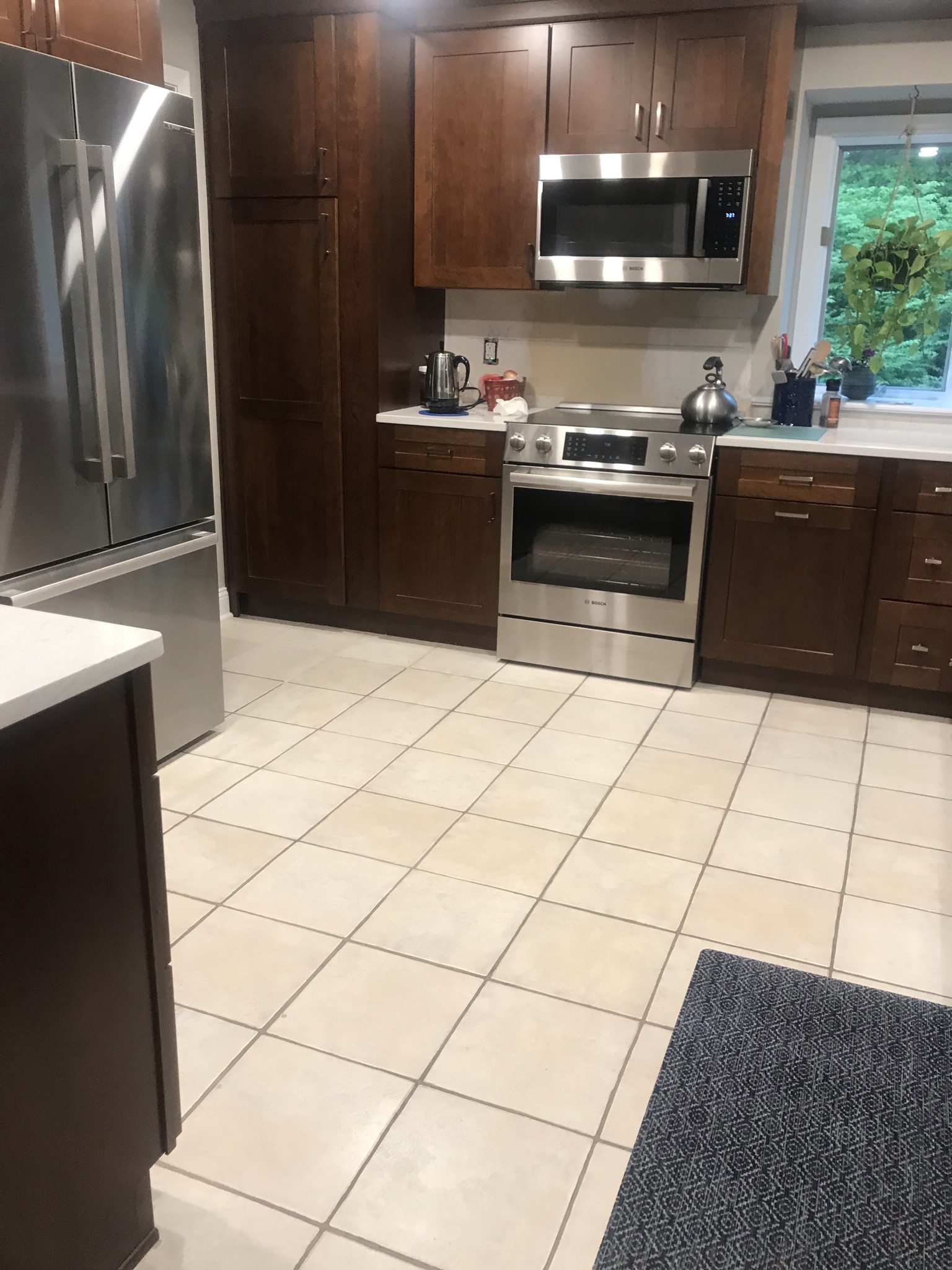 Thank you! The picture doesn’t show it well, but the original cabinets were more of an orangey oak color. The new cabinets are from Medallion cherry wood with a havana finish. It’s more of a rich brown , had to get away from the orange oak. We did a tear out, and got rid of a large soffit. I didn’t want the expense or time need to replace the tile floor that ran through the kitchen , powder room and laundry room, so had a grout sealer with a stain applied. That made a big difference. Still waiting on backsplash!