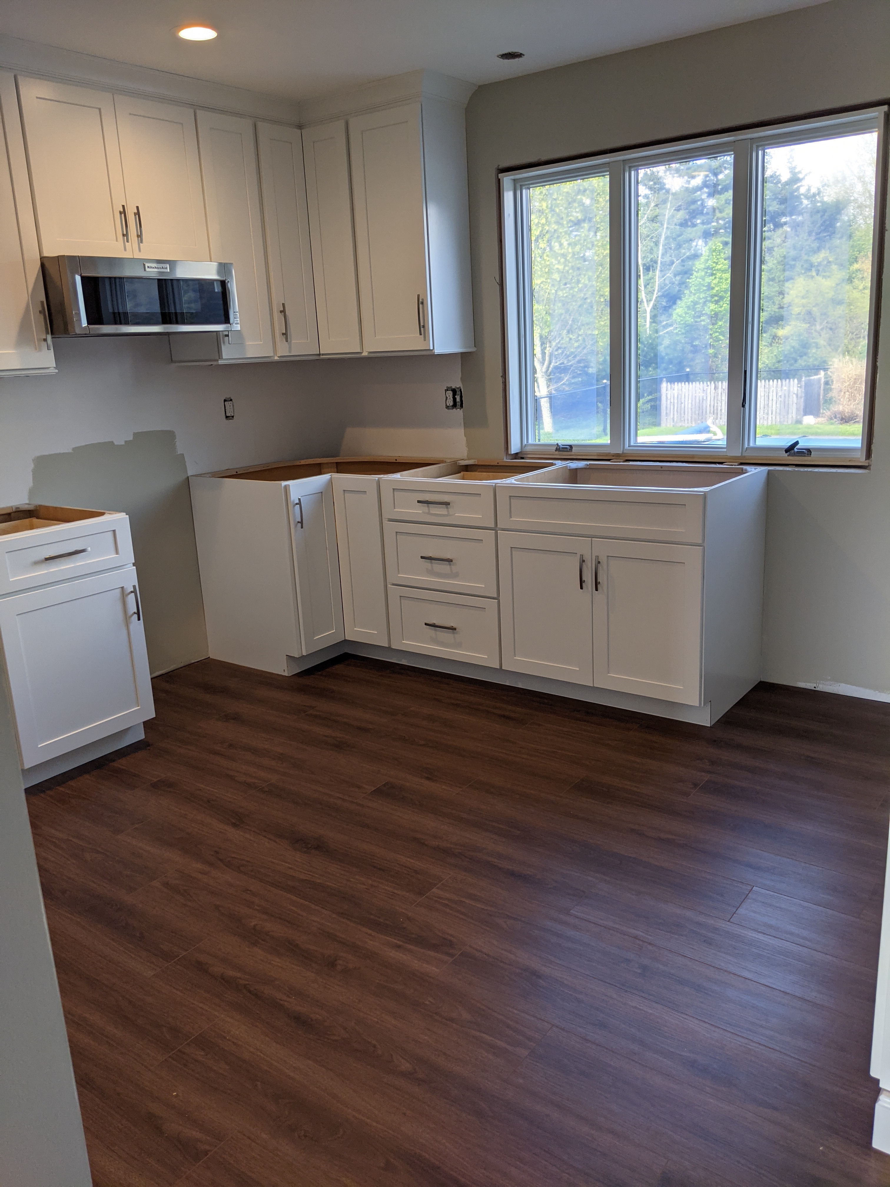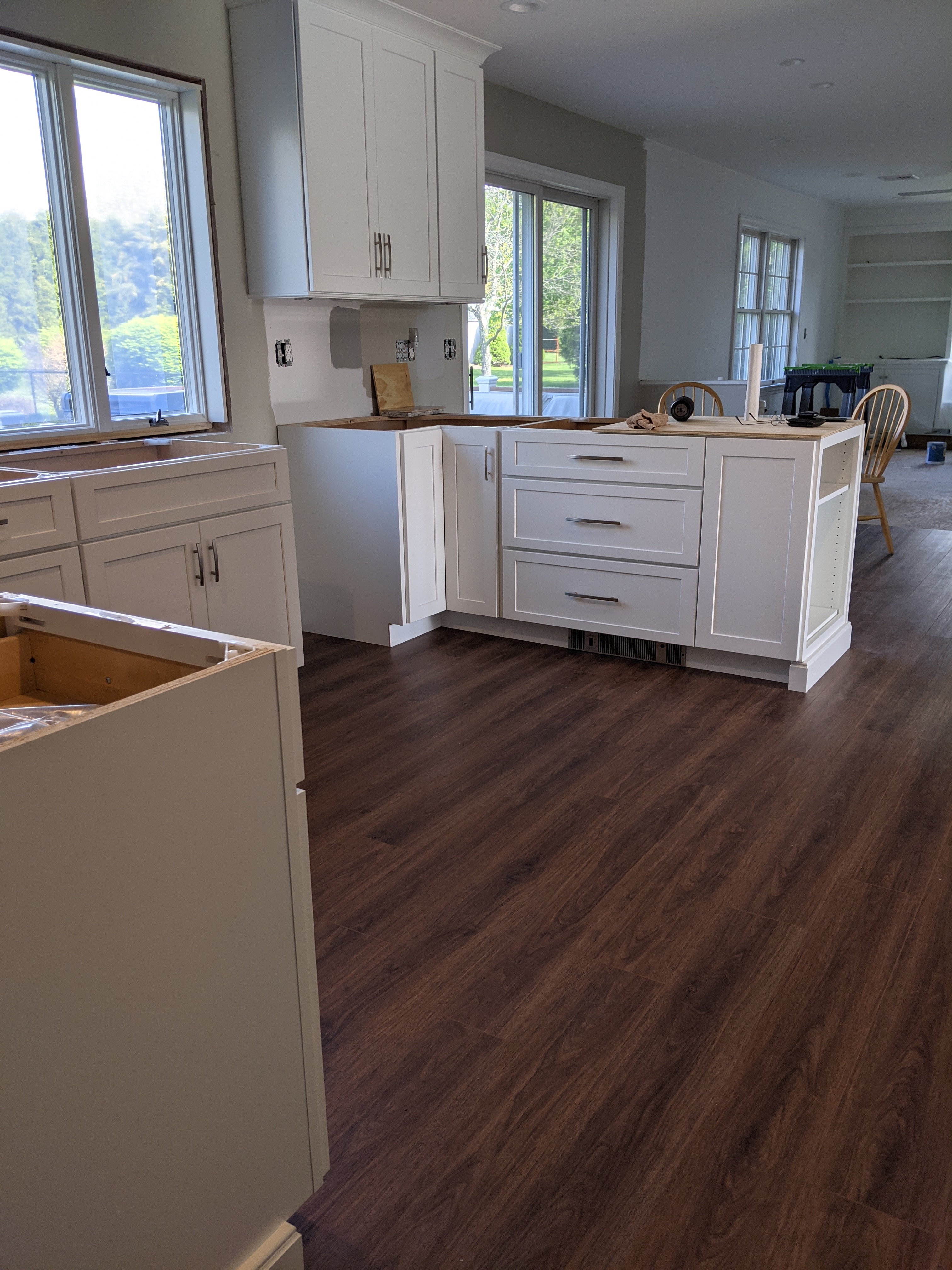 We are 2/3 done with our kitchen remodel, the choices are pretty stressful! We did go with white shaker cabinets and wood (well not really… LVP) floors. Attaching an image of its current state. We are waiting on countertops, Silestone Pietra quartz will be installed…hopefully next week. They are back ordered, as is the refrigerator. Struggling with paint and backsplash choices at the moment…!