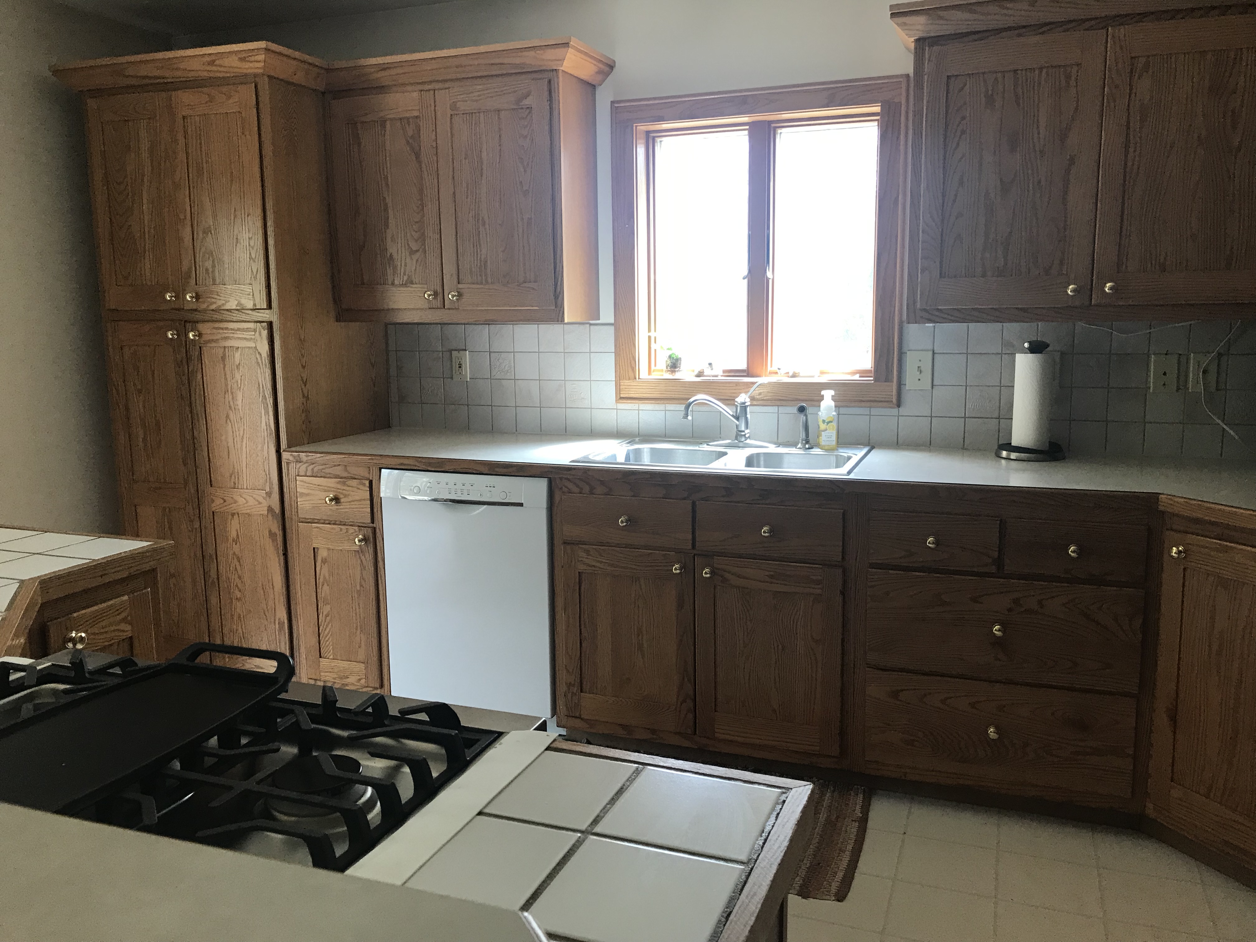 Here are 3 pictures of the current kitchen. The floor is vinyl and the countertops are Formica and tile