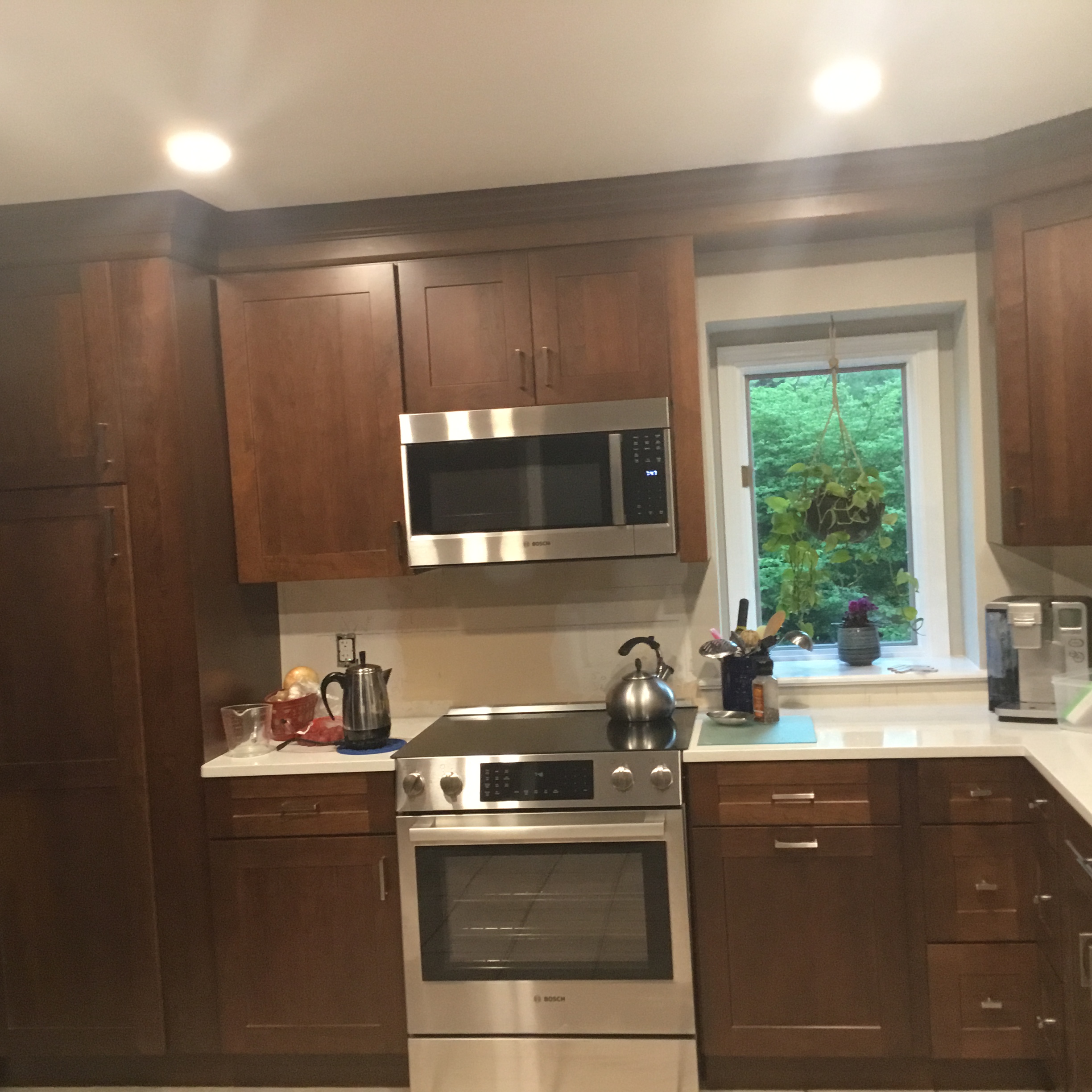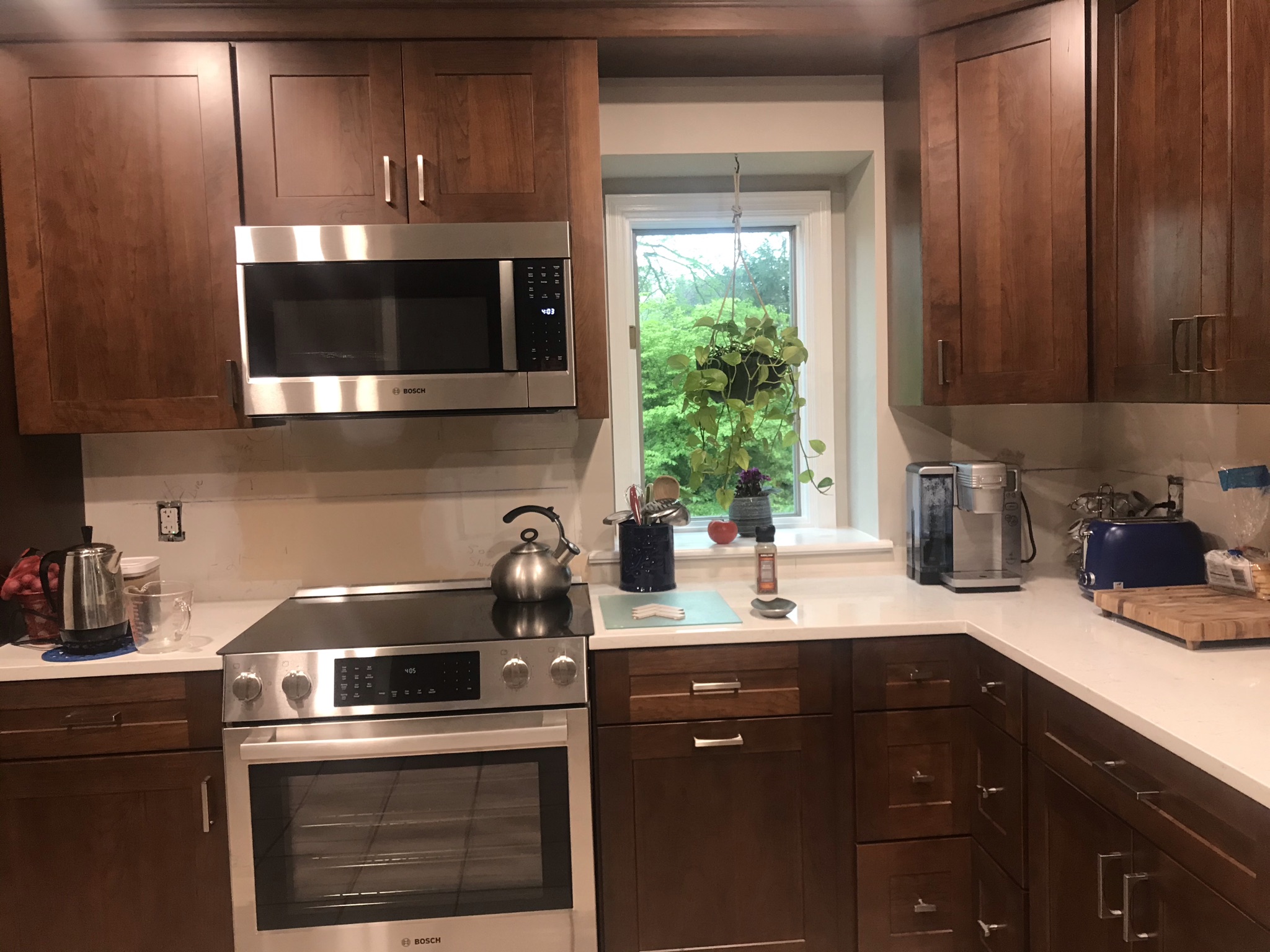 Coming to the end of a kitchen remodel. Didn’t want to change the floor plan or the floor( tile ) because of cost. Started with oak cabinets ( 1990) had soffits with plumbing that would have been $$$ to move into ceiling , so contractor raised. Happy with the outcome. Waiting on backsplash and grout on the floor tile will be stained and sealed. Ordered appliances nov 2020, last one was delivered a week ago!