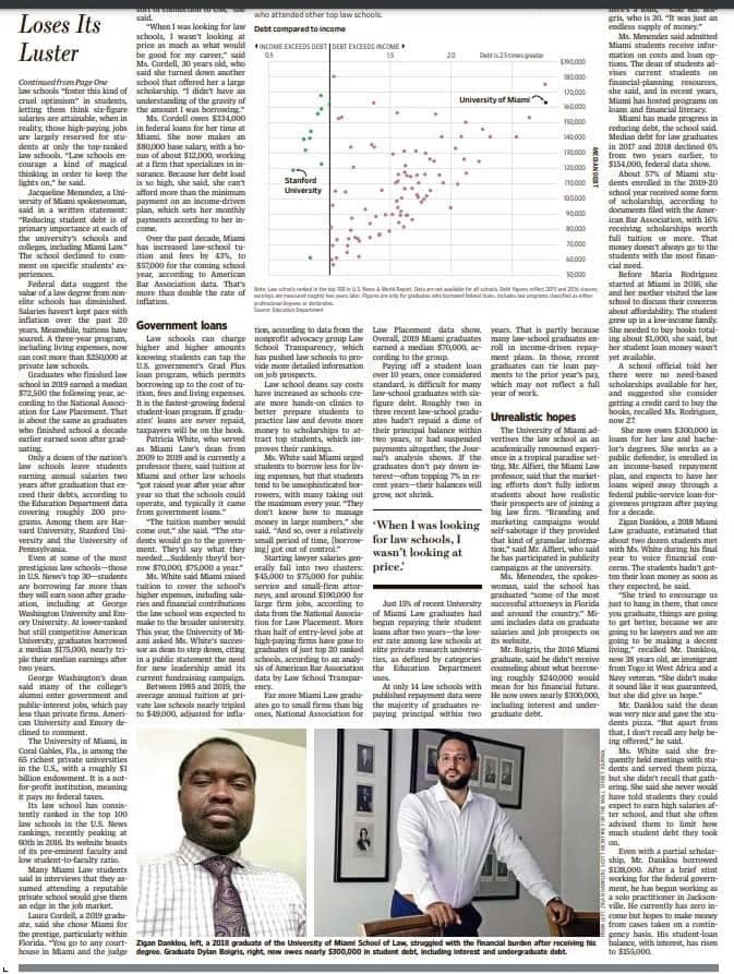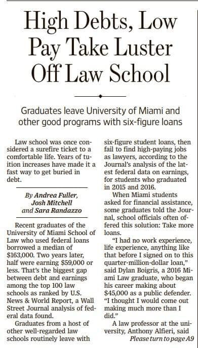 You hear about the ones that have taken on a lot of debt and not making the money to pay it off - their parents had to help shape their thinking. There is a facebook thread on “Paying for College in a Financially Sensible Way” and other groups that share information to help parents navigate college costs - and IDK the date of this article “High Debts, Low Pay Take Luster Off Law School – Graduates leave U of Miami and other good programs with six-figure loans” – saw it from a law graduate’s parent who knew to keep debt very low.