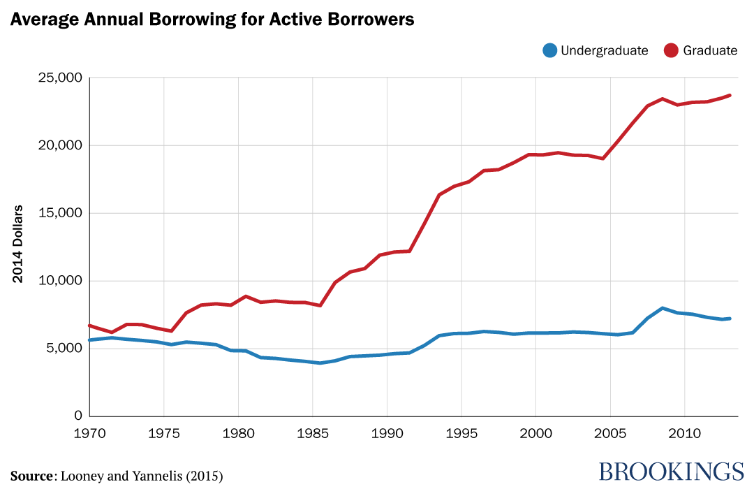 That link has the following image that shows that student loan borrowing increase is mainly at the graduate level. I.e. education like medical, dental, and law school.