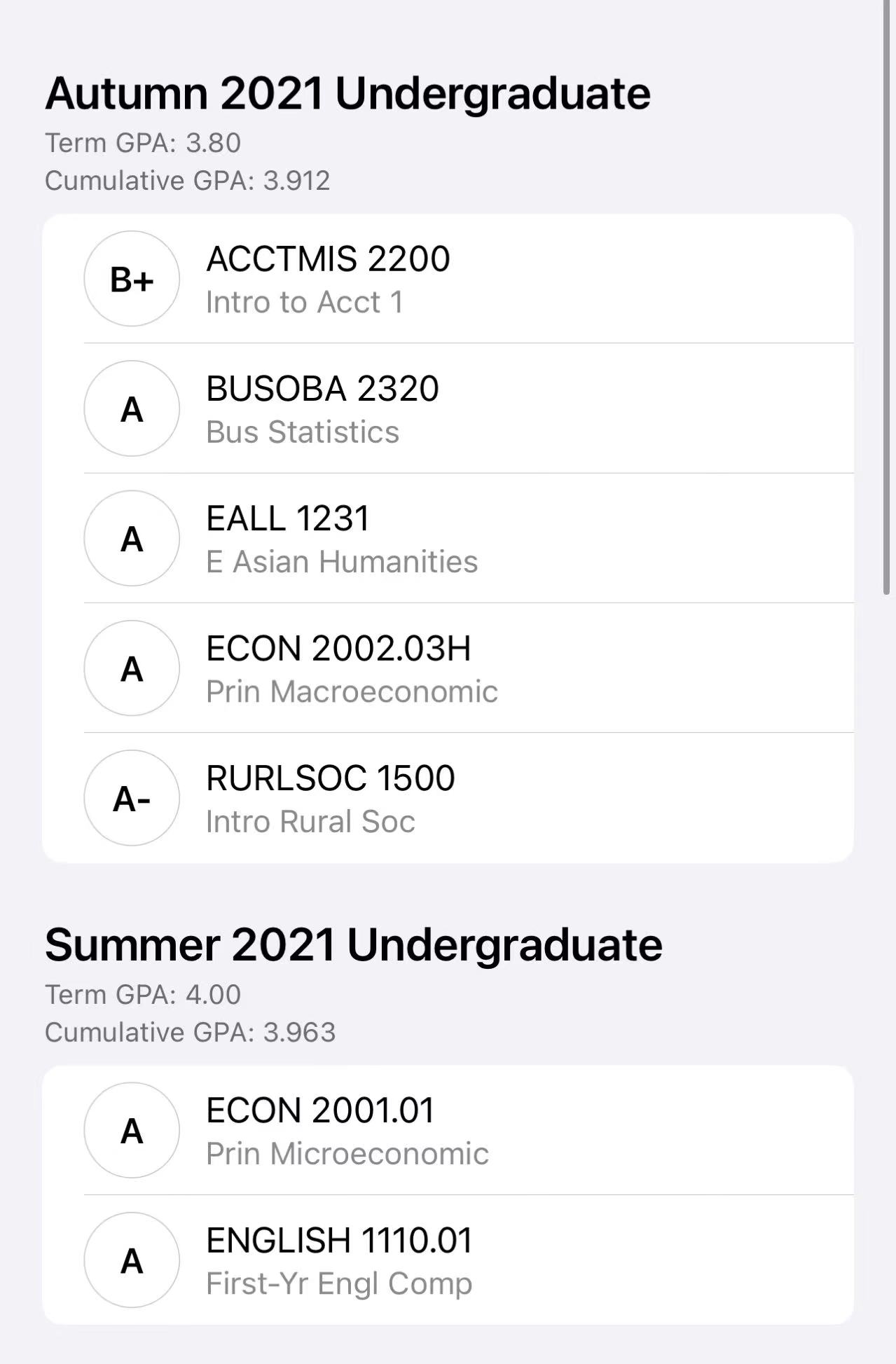 By the way, there are at least three universities that are “OSU”. I figured this was Ohio State due to the “Fisher” in your first post (and the college of business). Oregon State University for example has a very good DVM program, and there is also Oklahoma State University (home of Cowboys Football).
