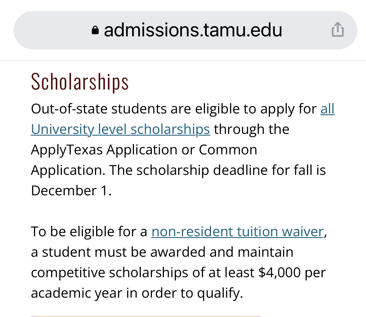 @1dadinNC not easy getting in state tuition waiver at Texas A&M. OOS student must be offered minimum $4k in A&M scholarships, and academic scholarships can’t be stacked. A&M makes it very difficult to get in state waiver, unless NMF.